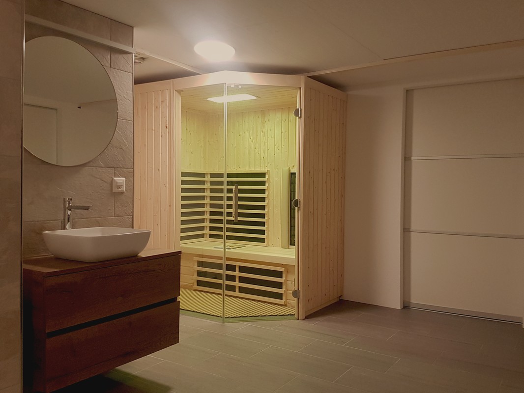 "Für den Ersatz unserer Eckbadewanne stand nur wenig Platz zur Verfügung: ca. 1,50 × 1,50 m. Dank der Fachleute von Saunaworld konnten wir eine professionelle Infrarotsauna realisieren, die sich perfekt in den Raum integriert und auf kleinstem Raum Platz findet. Wir sind begeistert, wie schnell die Infrarotkabine einsatzbereit ist, und saunieren regelmässig."