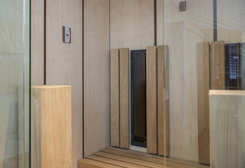 Anders als bei vielen gängigen Infrarotkabinen wirde hier viel Wert auf Design gelegt. Die grossflächigen Paneelen aus Ahorn, welche mit dunklen Federn unterbrochen werden, vermitteln ein edle Optik. Untermalt wird diese durch den Bank, die Rückenlehnen und die beiden Türme, welche in thermobehandelter Espe Ausgeführt sind. In den beiden Türem ist jeweils ein Infrarot- Vollspektrumstrahler eingebaut.