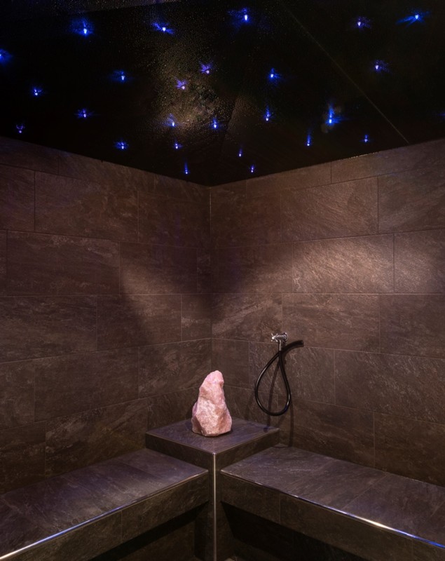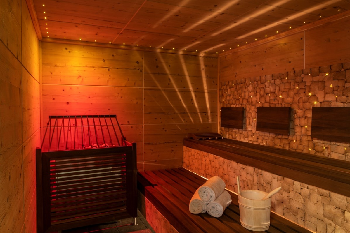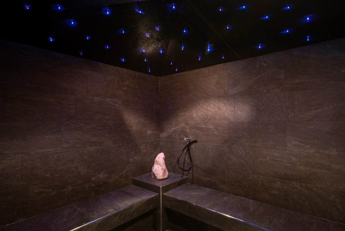 Eines der Highlights ist sicherlich die Sauna, welche aus Arvenholz gefertigt ist. Die Kombination mit den Holzscheiten zwischen und hinter den Bänken und die dunklen Saunabänke verleihen der Sauna einen rustikalen Charme. Das Beleuchtungskonzept der Sauna unterstreicht das Ganze Erscheidungsbild.
