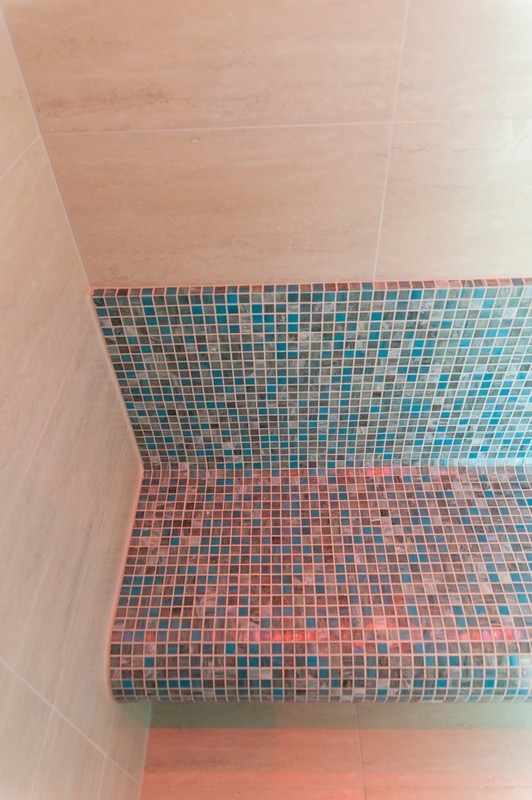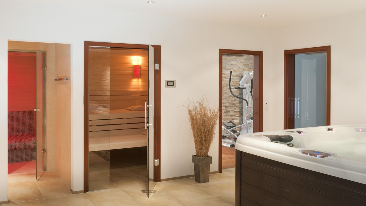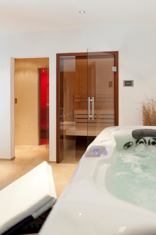 Sauna, Dampfbad, Whirlpool, Fitness- und Ruhebereich, alles was das Herz in Sachen "Wellness" begehrt wurde in diesem privaten Wellnessbereich integriert. Wiederkehrende Materialisierung und Farbgebung sowie dezente Beleuchtung lassen die einzelnen Komponenten zu einem harmonschen Ganzen verschmelzen.