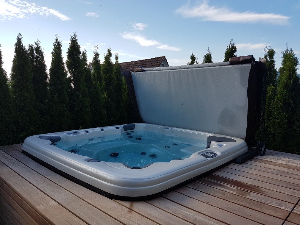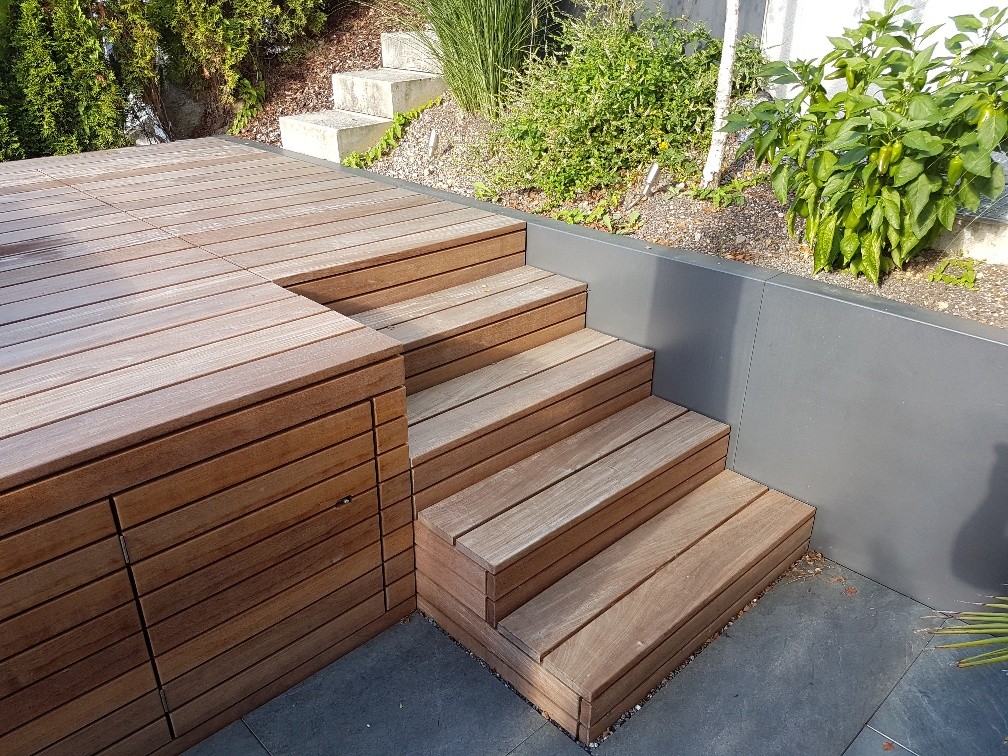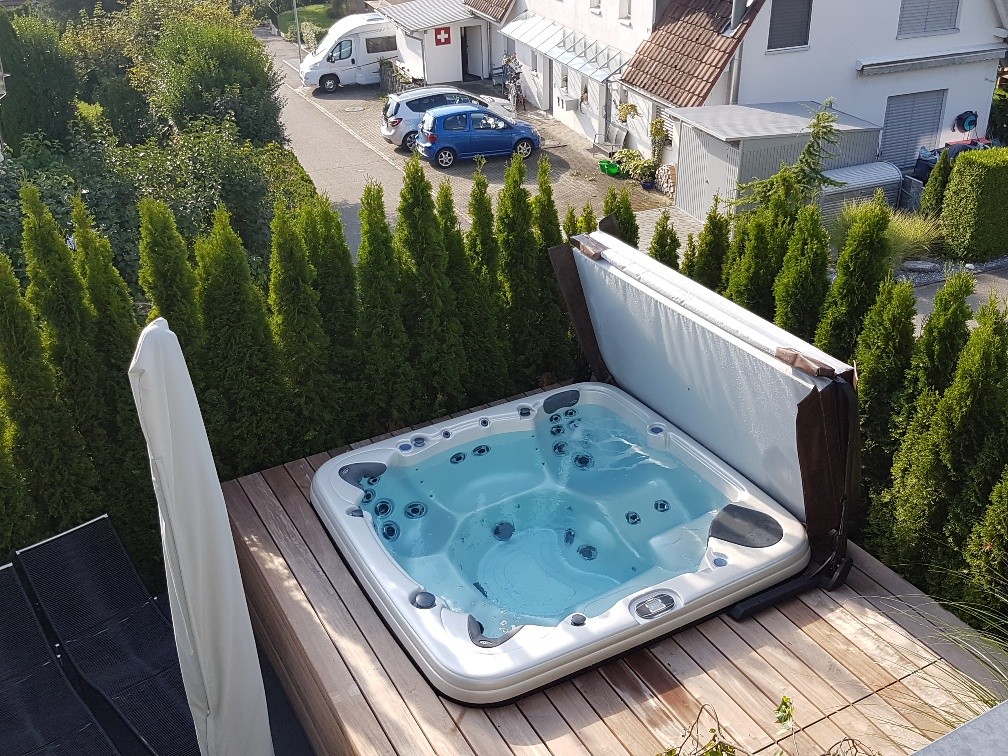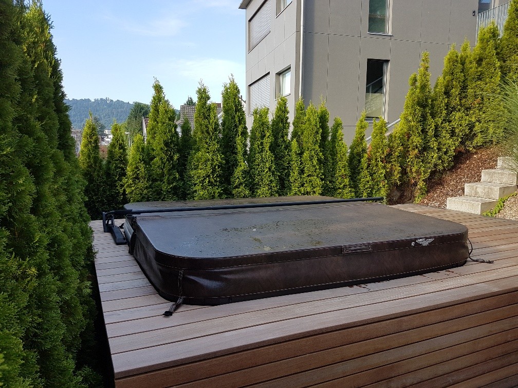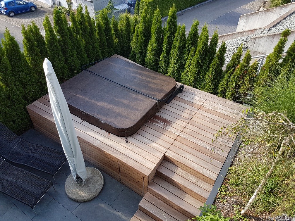Die Terrasse aus Holz, welche den Whirlpool umgibt, kann als Liegefläche und Abstieg auf die tiefer gelegenen Sitzplatz genutz werden. Durch eine Rvisiontür in der Holzkonstruktion ist die Servicefreundllichkeit der Whirlpooltechnik gewährleistet.