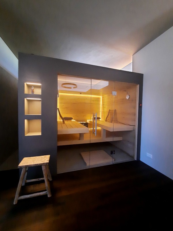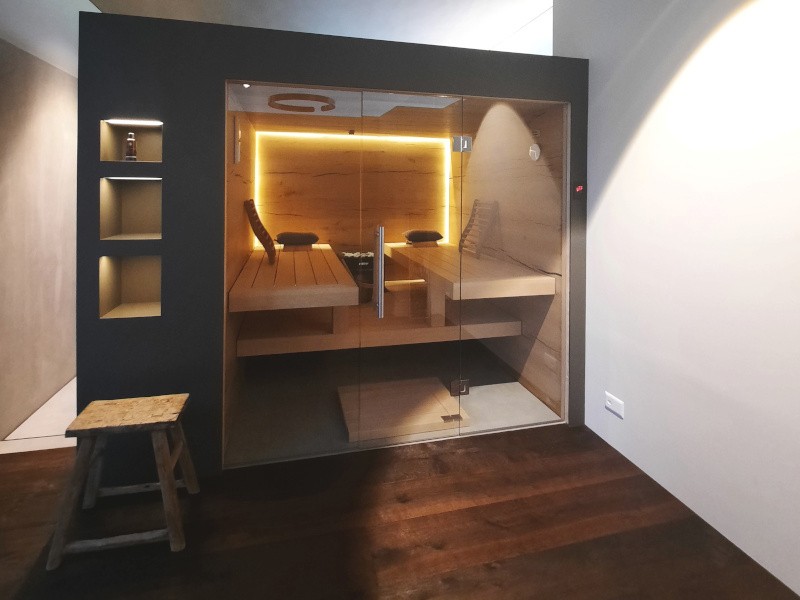 Modern und elegant, perfekt in den Raum integriert, so lässt sich diese Designsauna charakterisieren. Die fugenlose Front der Sauna, in schwarz gehalten, passt super zur ebenfalls fugenlosen Innenverkleidung der Sauna in Eiche rissig. Die Nischen links daneben bieten Platz für Saunazubehör- wie Saunatücher und Saunaaufgussmittel oder Deko. Auch wird durch diese Konstruktion der Eingang zur an die Sauna grenzende Dusche etwas schmaler, was den direkten Blick in die Dusche verhindert