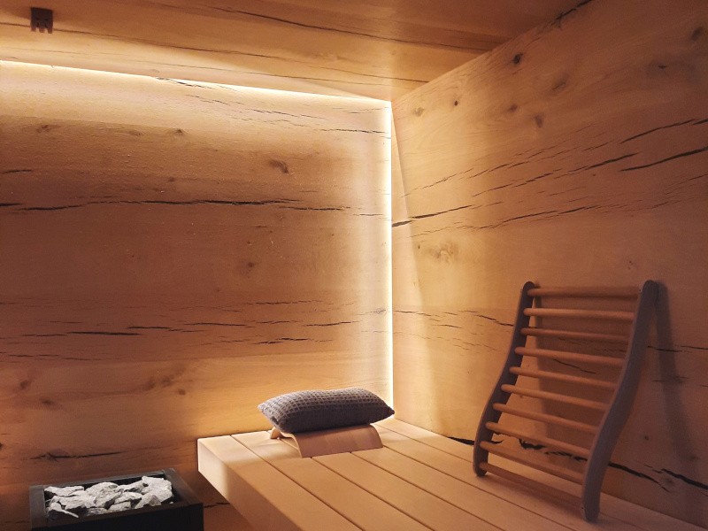 Die in der Sauna- Rückwand umlaufende Beleuchtung ist ein weiteres Highlight dieser Sauna. Durch das indirekte Licht bekommt die Sauna optisch mehr Tiefe und der Charakter des Holzes wird hervorgehoben. Das Saunalicht lässt sich dimmen, so kann die Lichtstimmung – wie auch die Beleuchtung im restlichen Raum – nach den eigenen Wünschen angepasst werden.