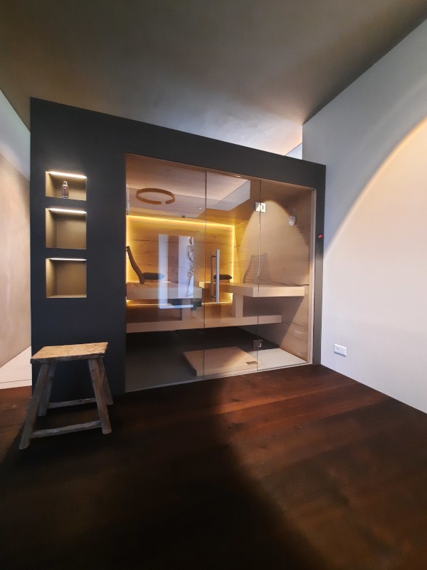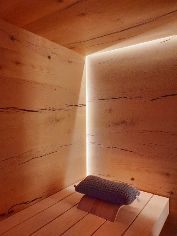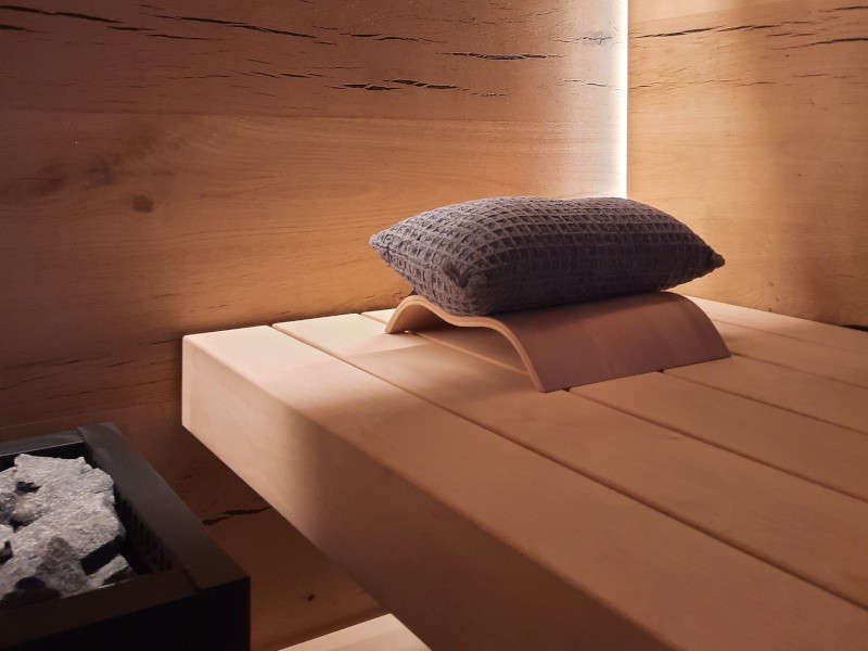 Die Anordnung der Saunaliegen ist symmetrisch aufgebaut, was, zusammen mit der zurückgesetzten Liegenabstützung, das Design der Sauna einzigartig macht.