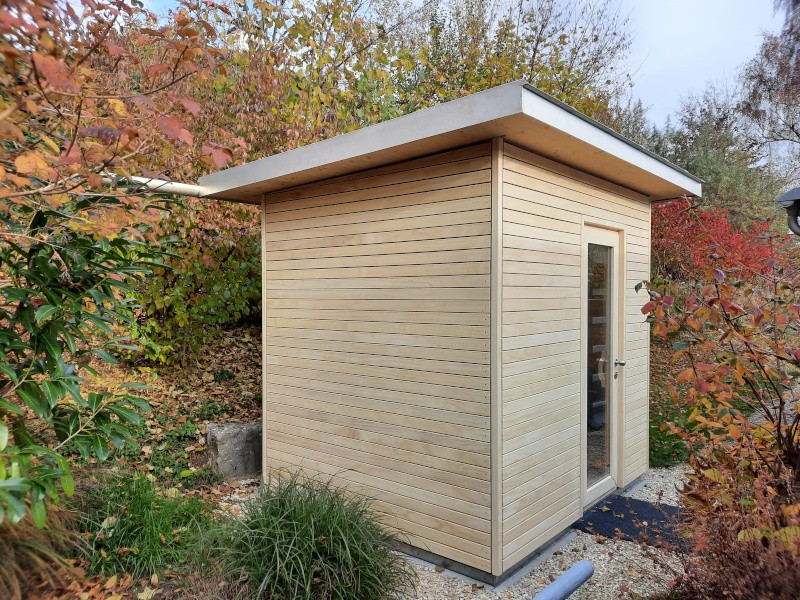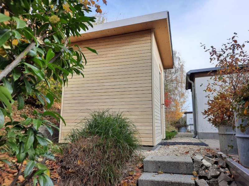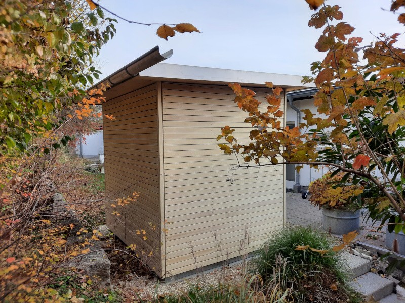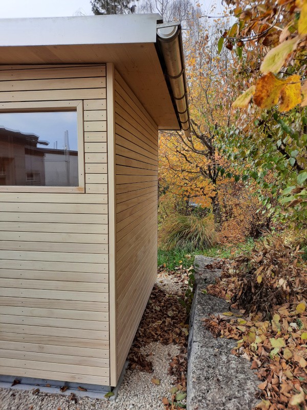 Das Dach der Gartensauna wurde als Pultdach ausgeführt und in Zusammenarbeit mit dem ortsansässigen Spengler gleich eingedeckt wie das angrenzende Wohnhaus.