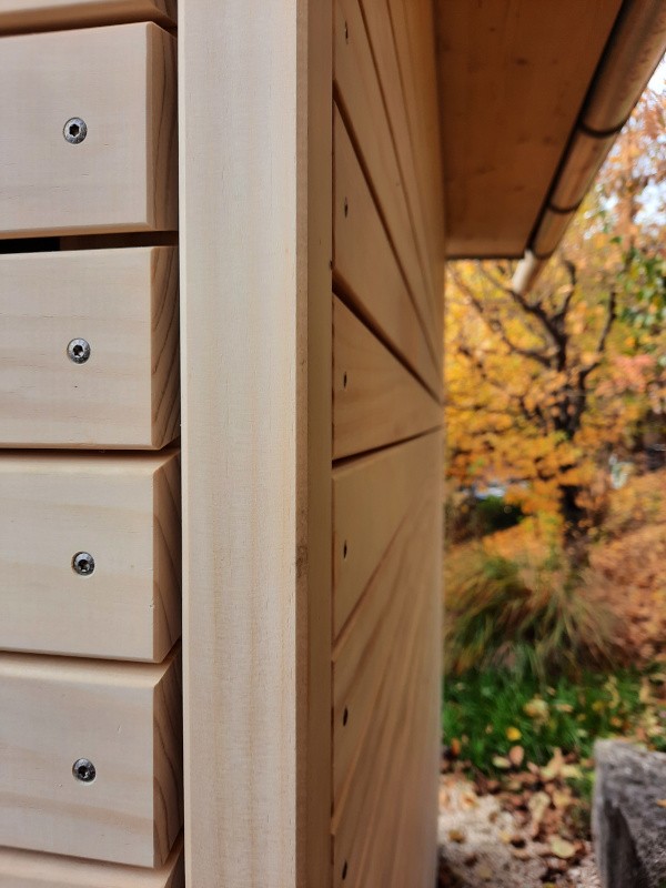 Innen Polarkiefer - Aussen Accoya! In dieser Kombination wurde die Aussensauna in der Region Schaffhausen ausgeführt. Die Saunakonstruktion wurde in Polarkiefer - Massivholzbauweise ausgeführt. Durch das langsame Wachsen – bedingt durch die Klimaverhältnisse in Skandinavien – ist die Polarkiefer ein dichtes und robustes Holz, das sich bestens für den Bau einer Massivholzsauna eignet. Durch die unterschiedliche Färbung von Kern (rötlich) und Splint (hell) ergibt sich eine spannende Optik.