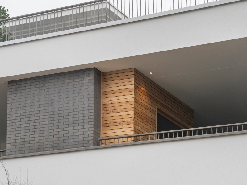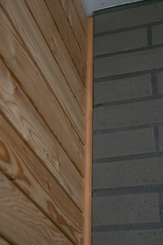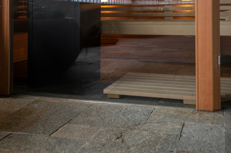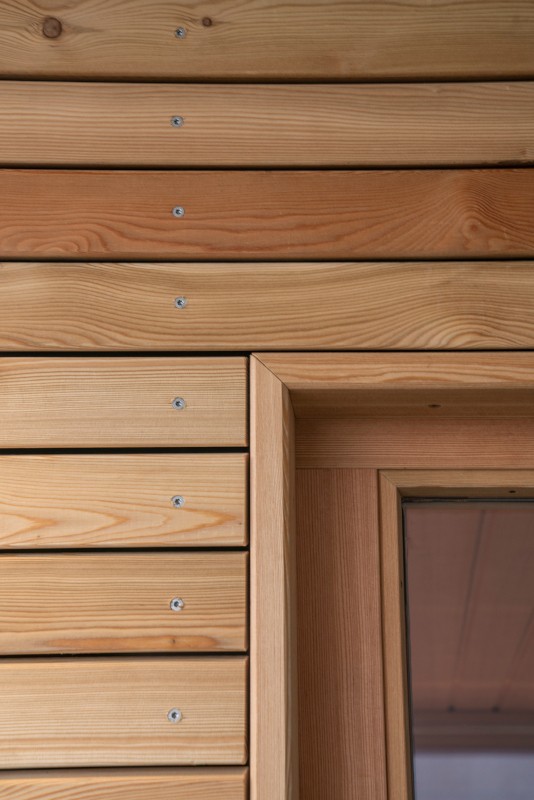 Die Sauna ist im Innern mit einer horizontalen Vertäfelung in Hemlock versehen, aussen wurde die Fassade in einer Rhomboid- Schalung in Lärche ausgeführt. Die beiden Hölzer harmonieren farblich gut zueinander und ergeben einen schönen Kontrast zu den anthrazitfarbenen Wandfliesen und dem Boden in Naturstein. Die sauber ausgeführten Details unterstreichen die Wertigkeit dieser Sauna.