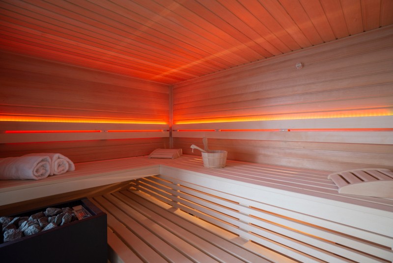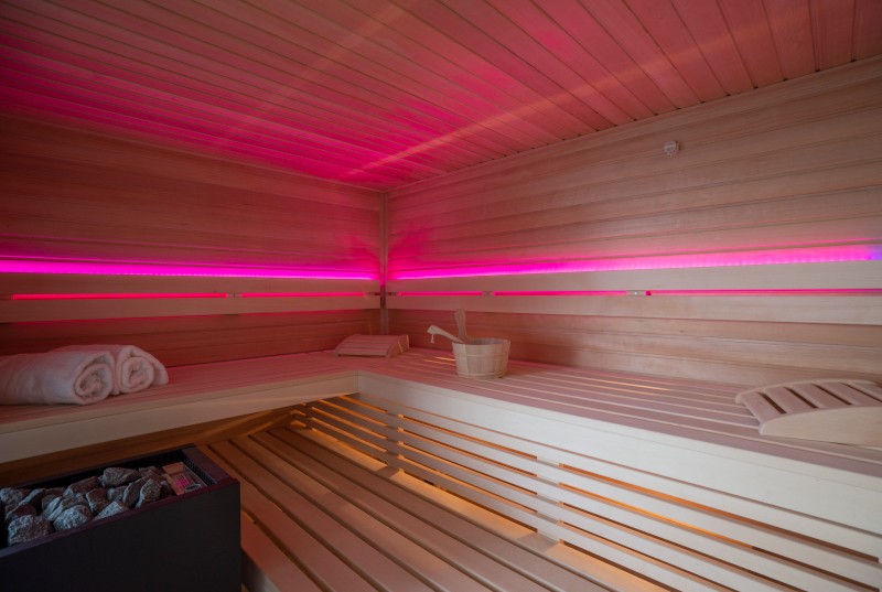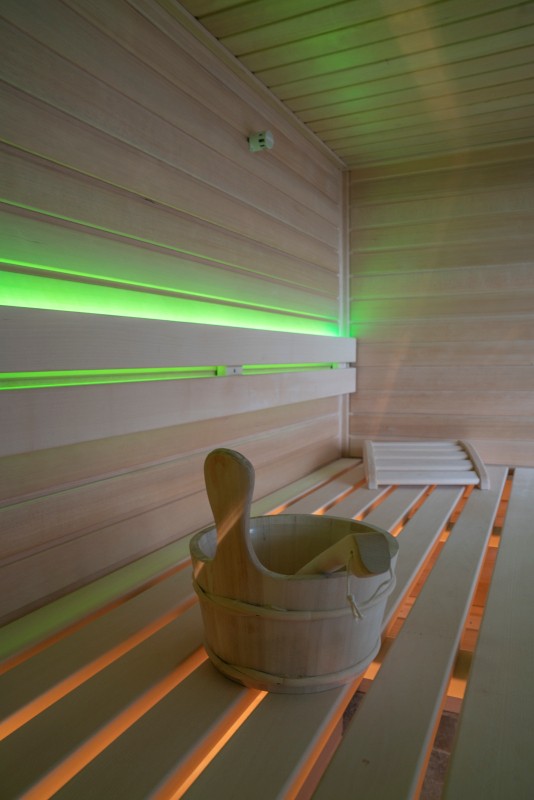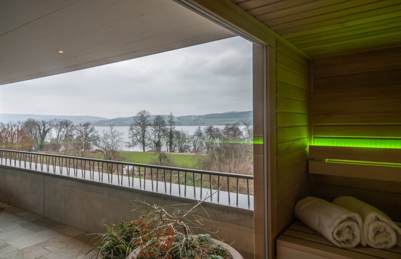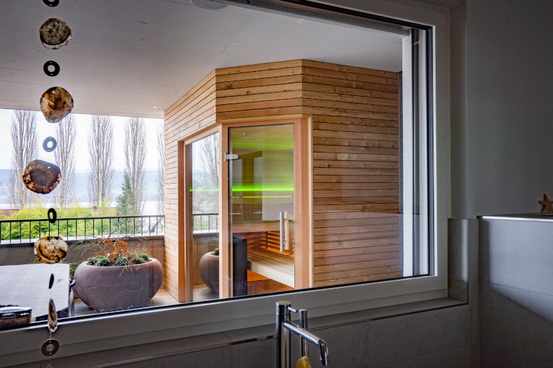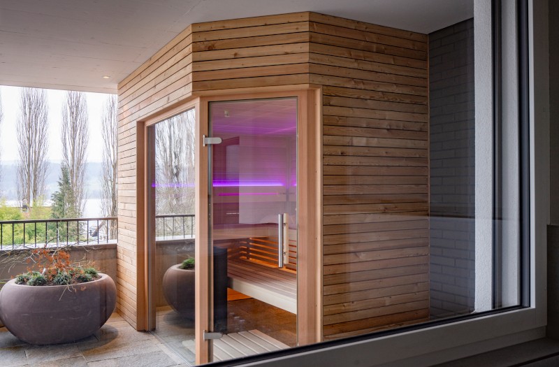 Nebst der angrenzenden Aussendusche, dem Whirlpool und dem direkten Zugang zum Badezimmer, rundet die Sauna den privaten Wellnessbereich ab. Gerade am Abend ist der Blick aus dem Badezimmer auf den Balkon - mit der Aussensauna - eine wahre Augenweide. Die farbige Saunabeleuchtung, in der Rückenlehne integriert, sorgt für ein dezentes, abwechslungsreiches Ambiente.