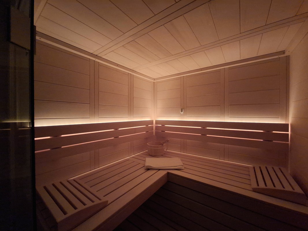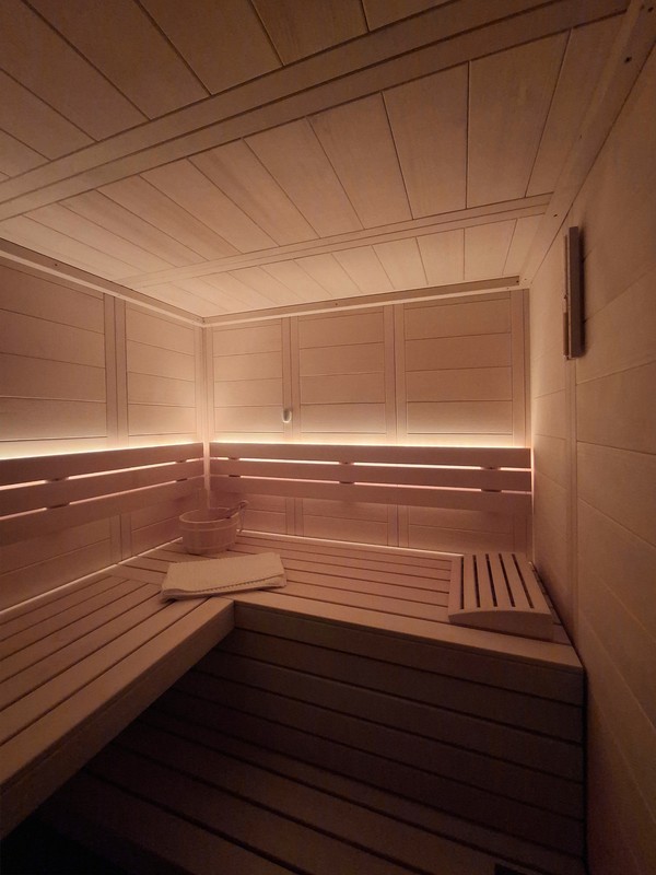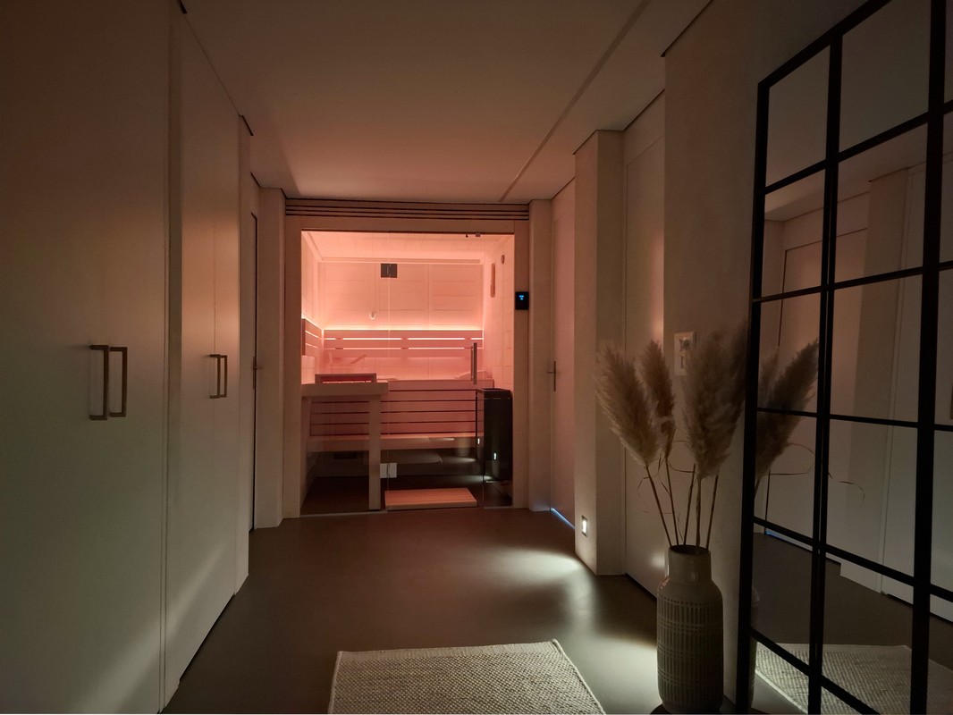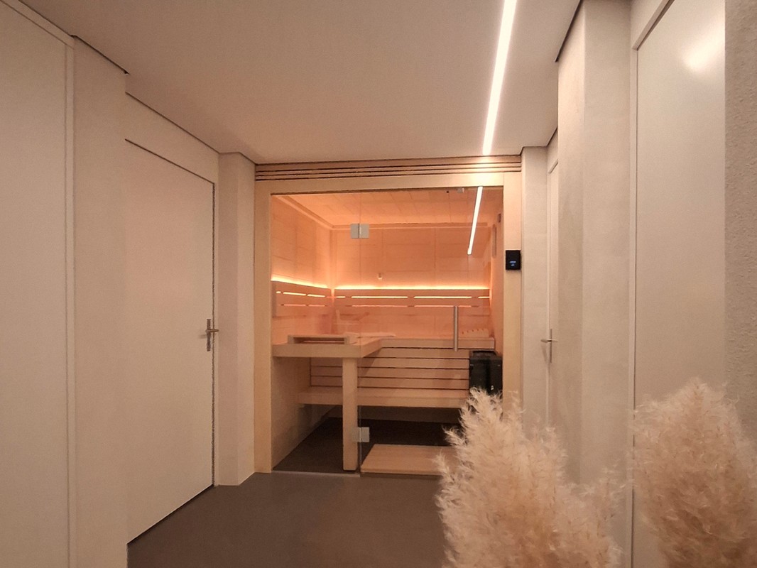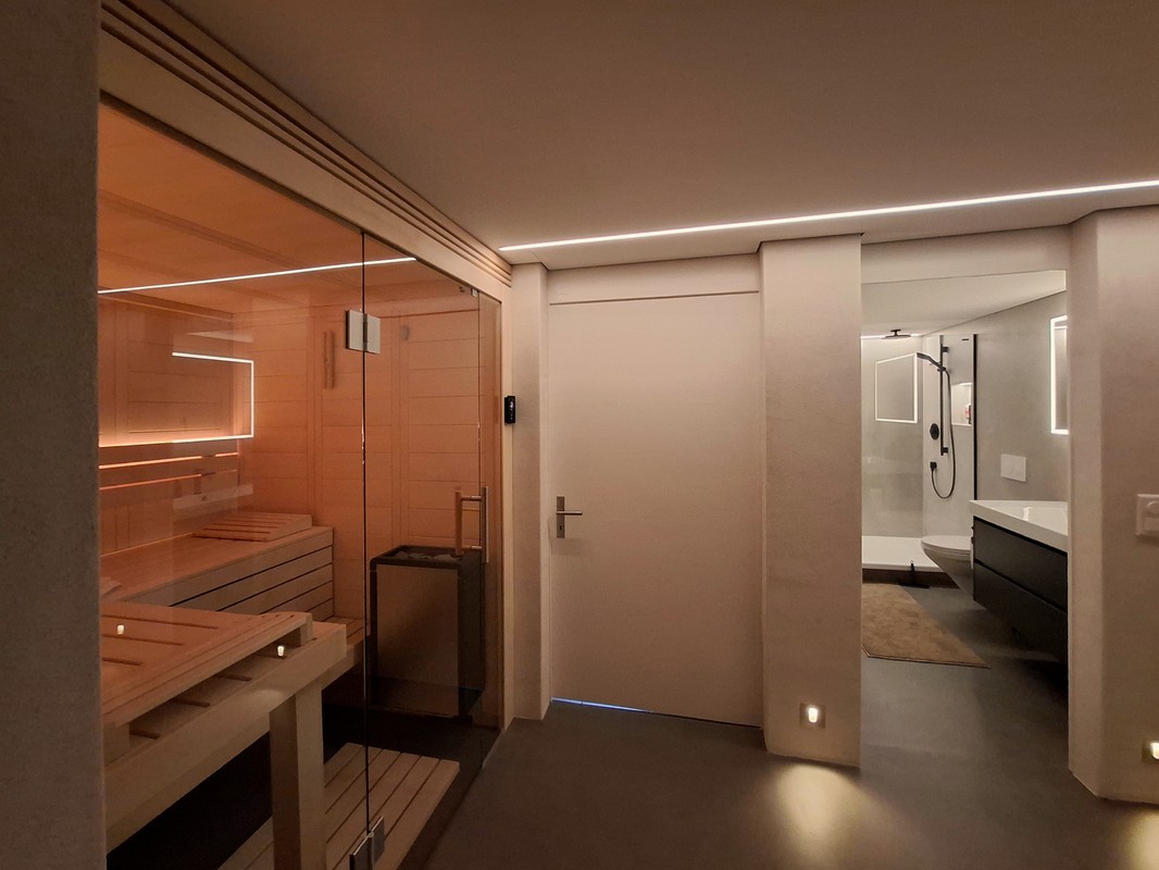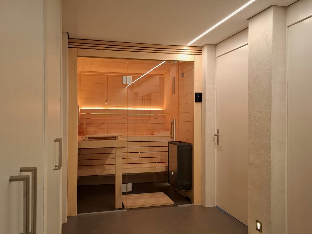Im Rahmen eines Kellerumbaus durften wir diese schöne Classico Massivholzsauna realisieren. Da die vorhandenen Platzverhältnisse etwas beschränkt waren und die Sauna der Blickfang am Ende des Korridors werden sollte, wurde die Sauna mit einer Ganzglasfront ausgeführt. Für die Beleuchtung hat sich die Bauherrschaft für eine warmweisse Lösung in der Rückenlehne entscheiden. Mit den vorhandenen Beleuchtungselemente vor der Sauna, lassen sich so verschiedene Stimmungen im Raum erzeugen.