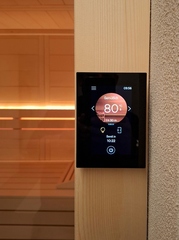 Beim Saunaofen wurde bewusst ein extra schmales Model eingesetzt, damit der Saunaofen in der Sauna nicht zu viel Platz einnimmt. Die Ausführung der Sauna ist in astarmer Fichte und die Inneneinrichtung in Linde. Die Materialisierung der Sauna fügt sich gelungen in das Raumkonzept ein.