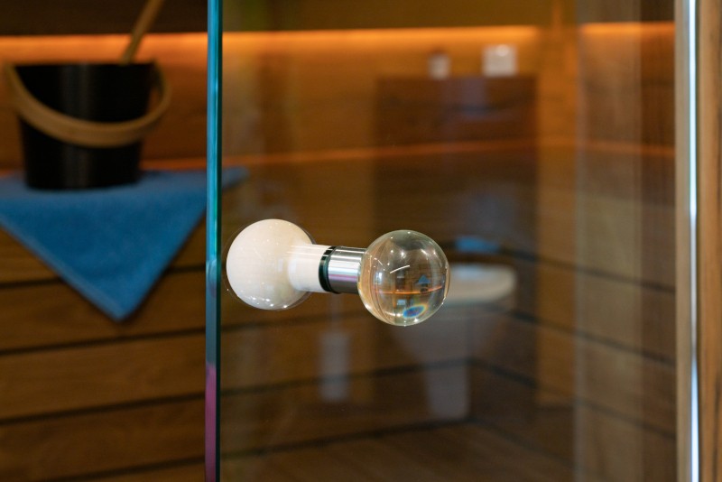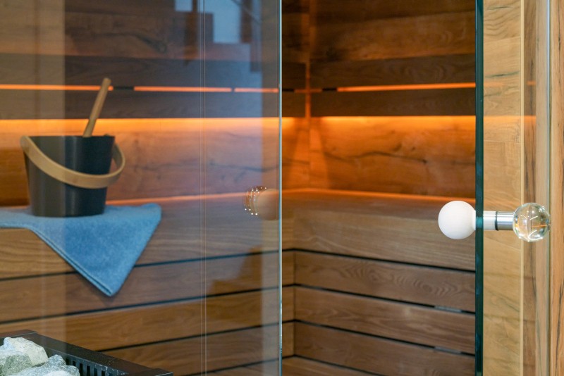 Die Sauna wurde sowohl innen wie aussen in einer Alt Eiche in Paneelenoptik ausgeführt. Die Bänke in Thermo- Esche harmonieren farblich sehr gut zu der Alt Eiche und unterstreichen die edle Optik. Die Glas Ecke ermöglicht den Blick in und aus der Sauna und lässt den Raum grösser wirken. Der schwarze finnische Saunaofen ist das Herzstück der Sauna. Die dezente, warmweisse Saunabeleuchtung, in der Rückenlehne der Sauna integriert, sorgt für ein wohliges Ambiente, das perfekt ist zum Entspannen.
