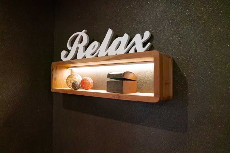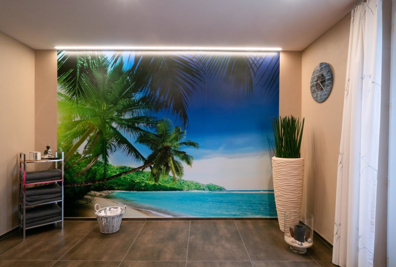 Ein weiteres Highlight dieses privaten Wellnessraumes ist die Gestaltung der Wände. Hier hat sich die Bauherrschaft – welche einen Maler-/ Gipser Betrieb betriebt – voll und ganz ausgelebt. Die beiden Bereiche Badezimmer und Sauna-/ Ruheraum wurden unterschiedlich ausgeführt. Die Wände des Badezimmers wurde mit einem goldenen Putzbelag versehen, der Saunaraum mit Ruhebereich mit einem schwarzen Putzbelag mit Goldpigmenten. Als verbindende Elemente zwischen zwei Bereichen dienen einerseits der Bodenbelag aber auch die beiden Fototapeten mit Ferienmotiven, welche das Arbeiten zumindest für eine gewisse Zeit vergessen lassen…