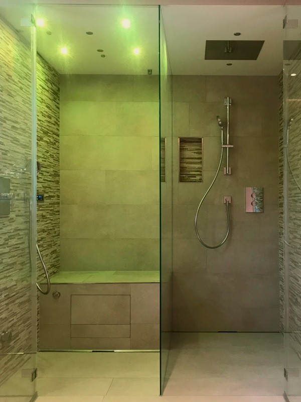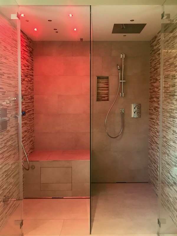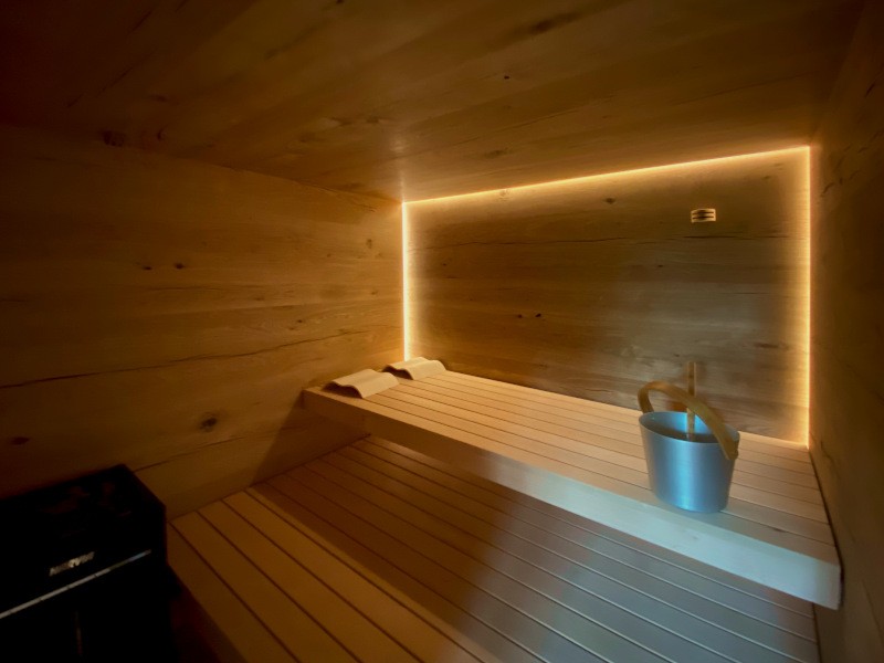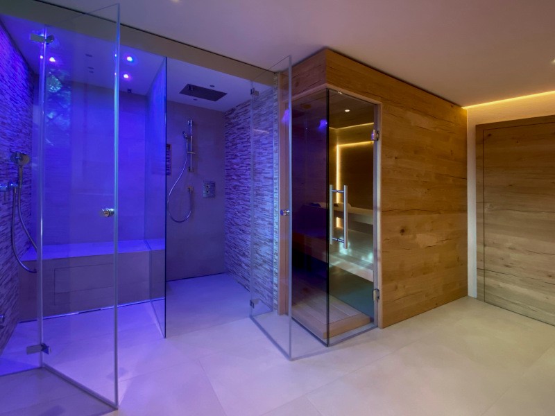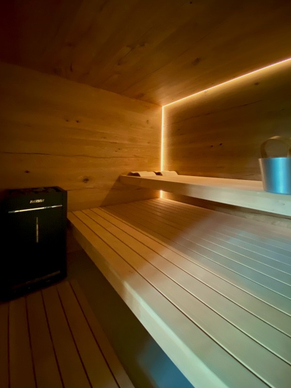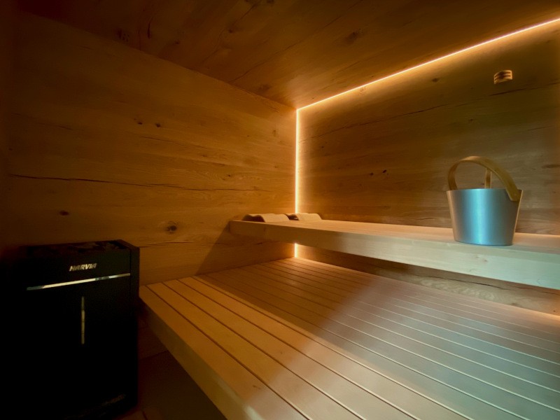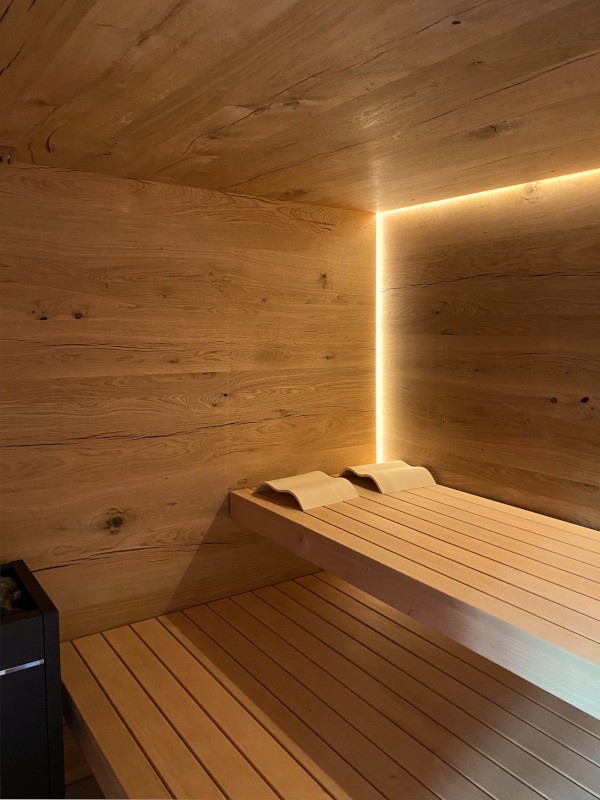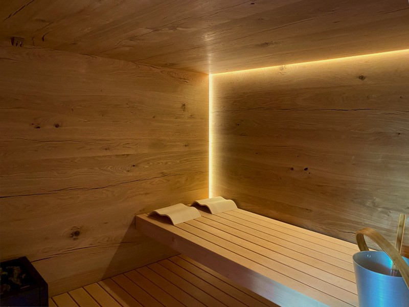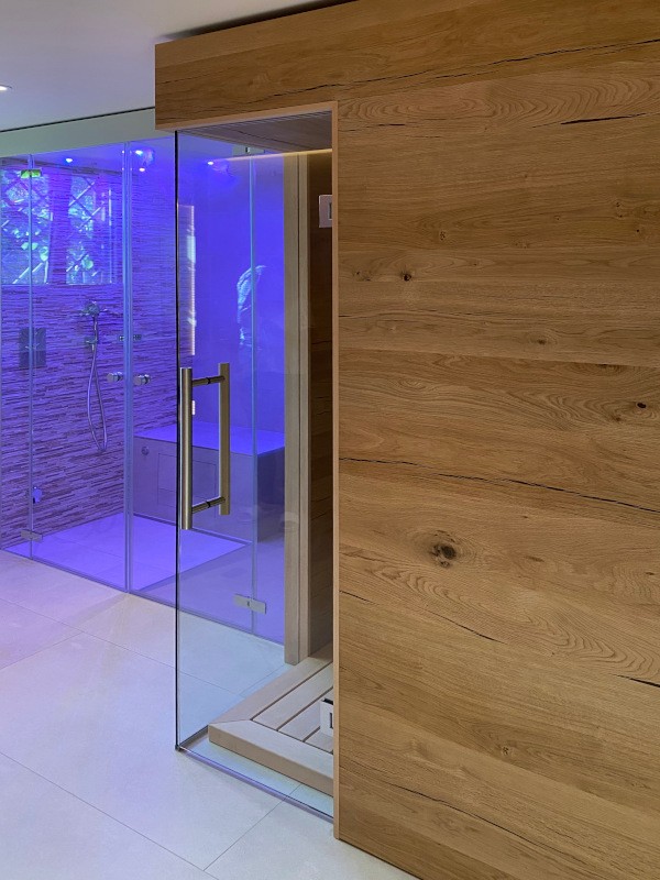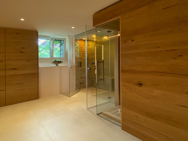 Im nicht isolierten Kellerraum entstand eine edle, grosszügige Sauna, eine Dampfdusche mit einer separaten Dusche sowie genügend Platz für Liegemöglichkeiten zum Ausruhen.