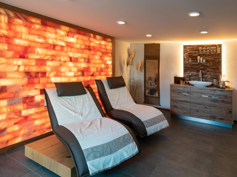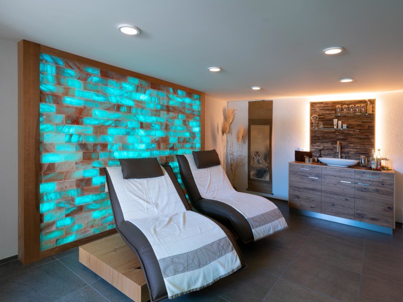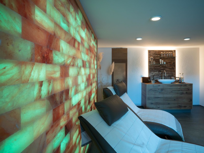 In einem ersten Schritt wurde zusammen mit der Bauherrschaft ein Raumkonzept mit der entsprechenden Wellnesselementen entwickelt. Aufgrund der Wasserinstallationen, welche sich im Nebenraum befanden, war die Position der Dampfdusche gegeben. Gleich daneben wurde die Sauna geplant, mit der Herausforderung, das bestehende Fenster in die Sauna zu integrieren. Die Sauna und die Dampfdusche wurden so geplant, dass sie durch die verbindende Front optisch als Einheit wirken. Das optische Highlight des Raumes ist die beleuchtete Salzsteinwand, welche dem Raum zusammen mit den passenden Farb- und Beleuchtungskonzept einen entspannenden Wellnesscharakter verleihen. Die Wellnessliegen, ein TV und die beleuchtete Teeküche runden den das Konzept des Wellnessraumes ab.
