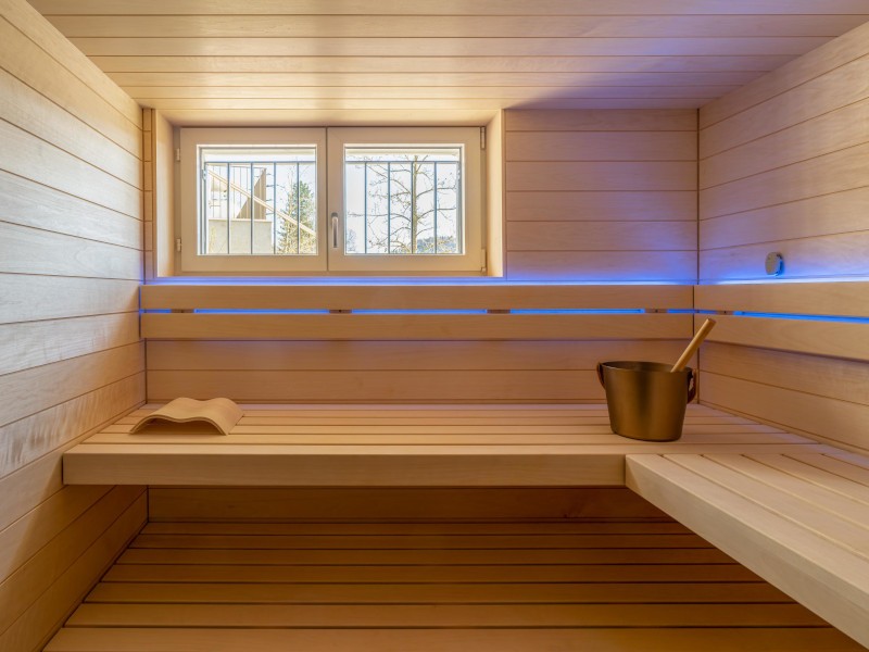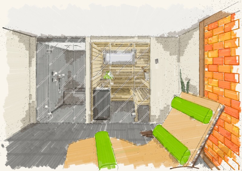 Der Wunsch der Bauherrschaft war eine Wellnessoase in ihrem bestehenden Heim zu erstellen. Dafür vorgesehen war der mittlerweile ungenutzte Bastel-/ und Spielraum mit rund 40m2 im Untergeschoss. Sauna, Dampfdusche, Ruheecke mit Fernseher sowie eine Teeküche waren die Vorgaben, welche zwingend integriert werden mussten.
