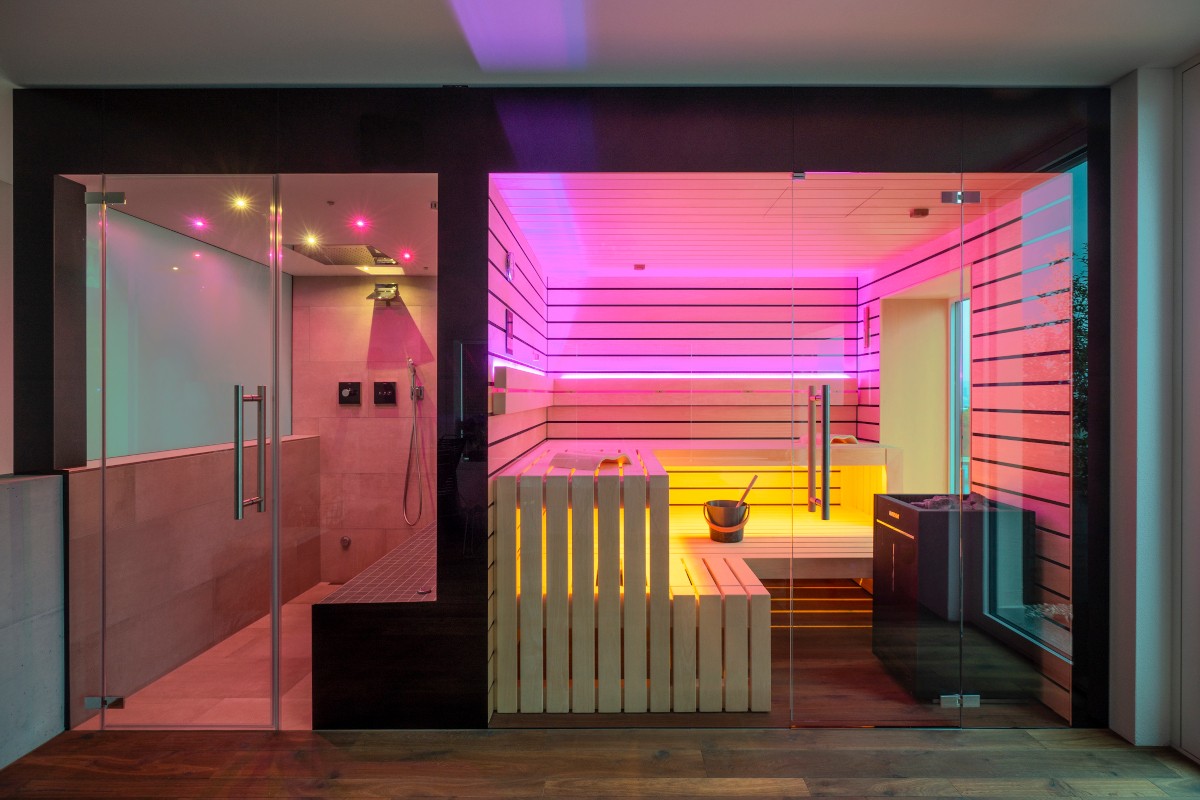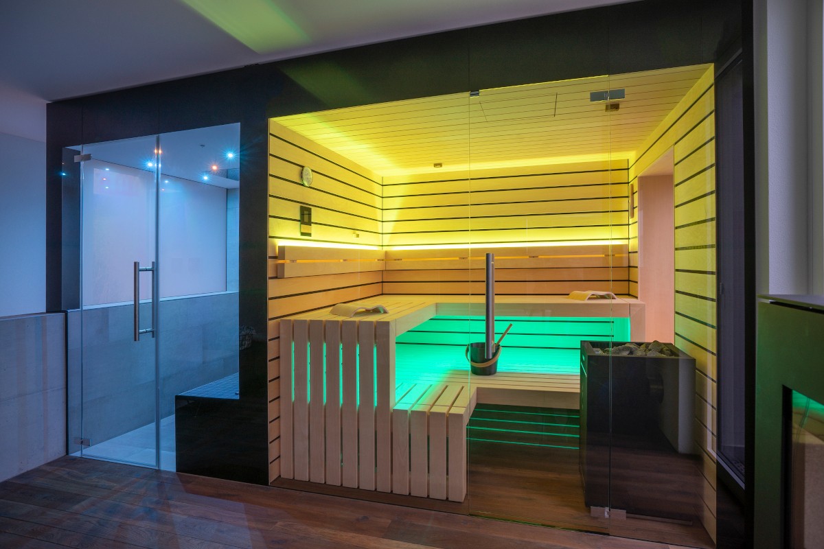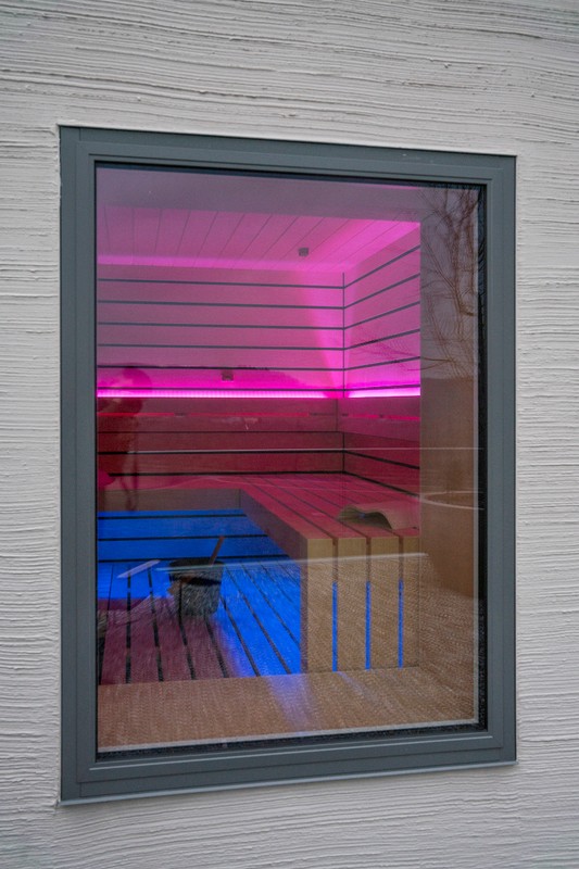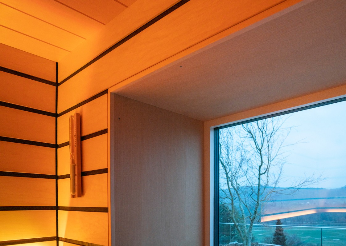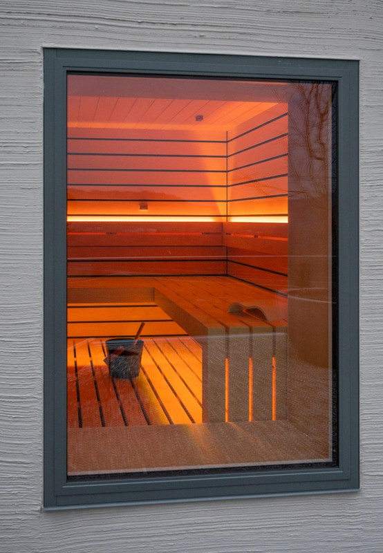 Die Sauna besticht durch hochwertiges Saunaholz, Täfer im breiten scharfkantigen Espe Design mit dunkler Feder. Grosse Fensterfronten, einmal mit Blick in die Berge und einmal zum Bad hin, lassen die Natur in die Sauna und öffnen den Raum optisch nach innen wie aussen. LED-Farblichter in den Rückenlehnen und der unteren Liege schaffen eine besonders heimelige Atmosphäre. Auch die Liegen bestechen durch hohe Individualität: Die oberen Liegen sind mit 70 cm extrabreit für bequemes Liegen. Die untere Liege verläuft bis zur Rückwand, wodurch die Sauna offener und grossflächiger wirkt. Im Fokus ein echter finnischer Saunaofen, der auch den Bi-O-Saunabetrieb erlaubt. Die Lieblingsmusik über Bluetooth sorgt für wahres Entspannungsfeeling.
