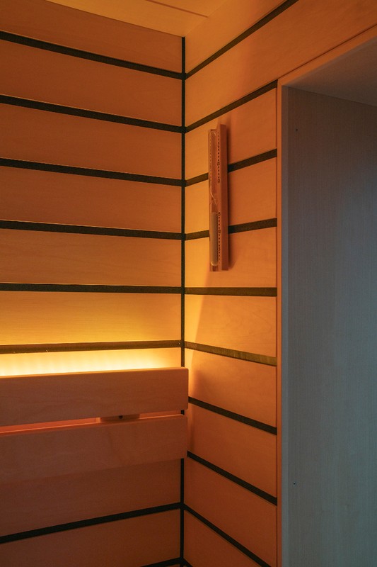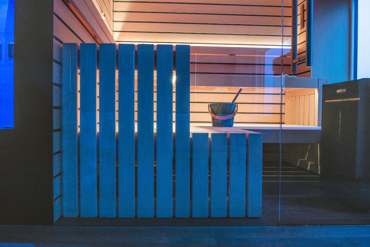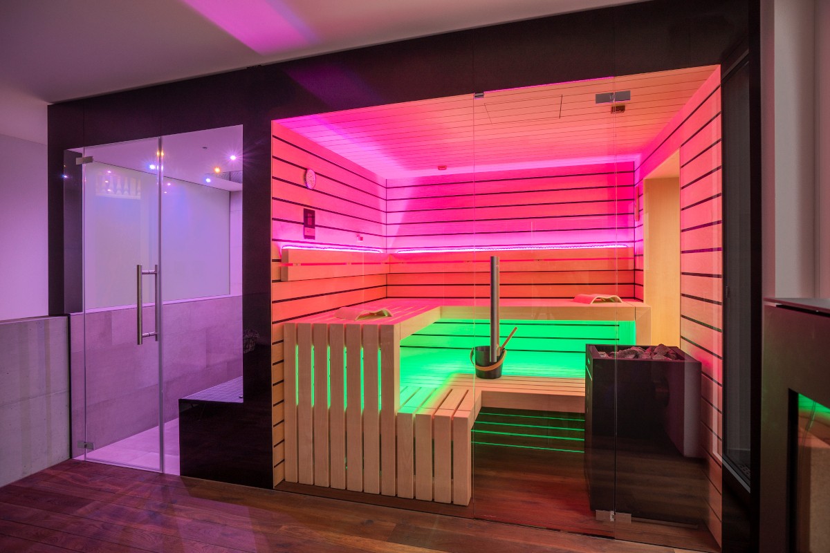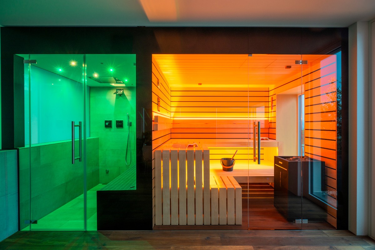 Die Sauna besticht durch hochwertiges Saunaholz, Täfer im breiten scharfkantigen Espe Design mit dunkler Feder. Grosse Fensterfronten, einmal mit Blick in die Berge und einmal zum Bad hin, lassen die Natur in die Sauna und öffnen den Raum optisch nach innen wie aussen. LED-Farblichter in den Rückenlehnen und der unteren Liege schaffen eine besonders heimelige Atmosphäre. Auch die Liegen bestechen durch hohe Individualität: Die oberen Liegen sind mit 70 cm extrabreit für bequemes Liegen. Die untere Liege verläuft bis zur Rückwand, wodurch die Sauna offener und grossflächiger wirkt. Im Fokus ein echter finnischer Saunaofen, der auch den Bi-O-Saunabetrieb erlaubt. Die Lieblingsmusik über Bluetooth sorgt für wahres Entspannungsfeeling.