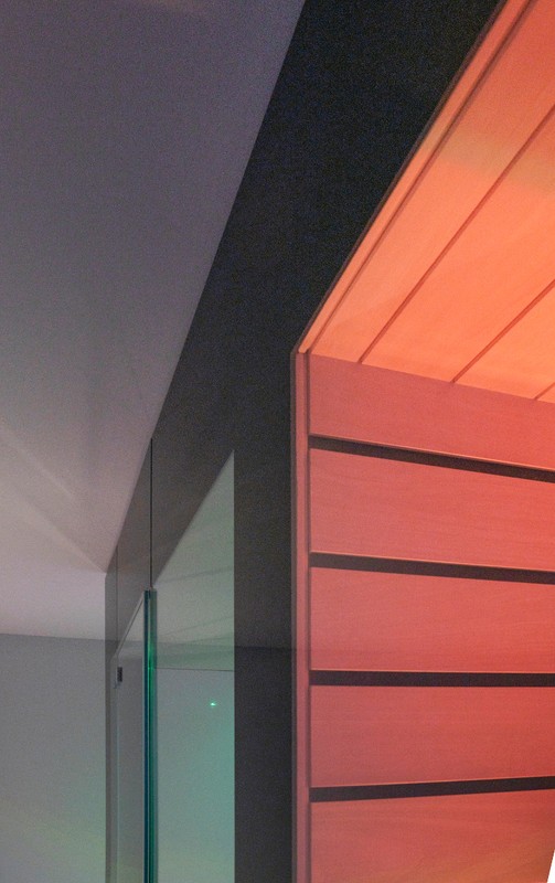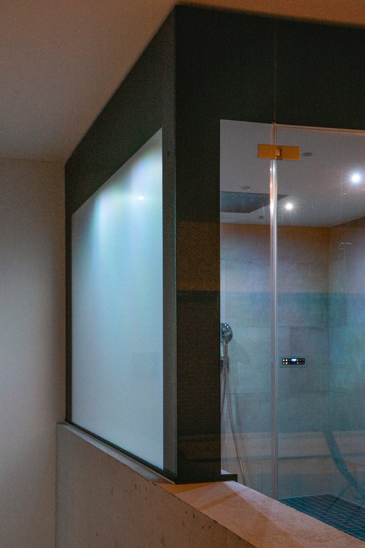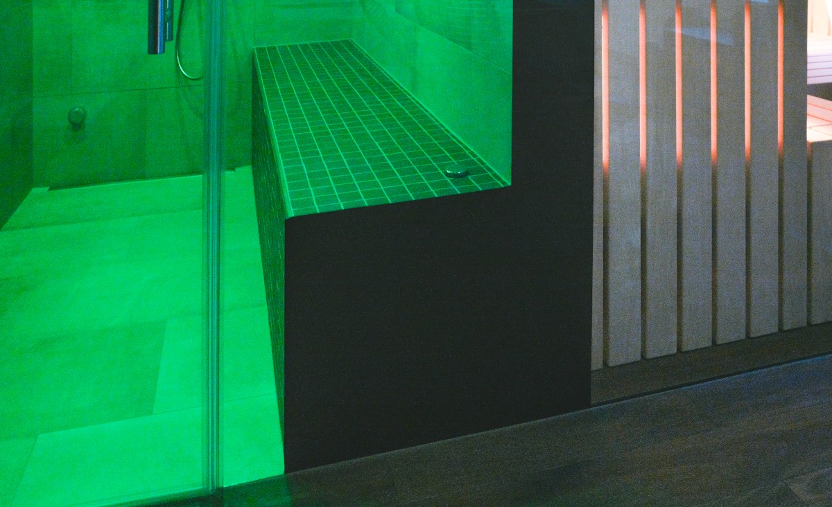 Die angrenzende Dampfdusche besticht durch ihre grossformatigen Fliesen in edlem Grau. Zum Schutz der Intimsphäre wurde das Glas auf einer Seite mit einem Verlauf sandgestrahlt. Für das „normale“ Duschen wird weisses Funktionslicht und für erholsame Dampfsitzungen Farblicht aktiviert. Eine grosse Regendusche wurde flächenbündig in das Dach aus Mineralwerkstoff eingebaut, ebenso wie spezielle Lautsprecher. Sprühnebeldüsen in der Decke sorgen für gezielte Abkühlung und die integrierte Sitzheizung im Dampfsitz, der die Dampftechnik unsichtbar versteckt hält, lädt zum komfortablen Verweilen ein.