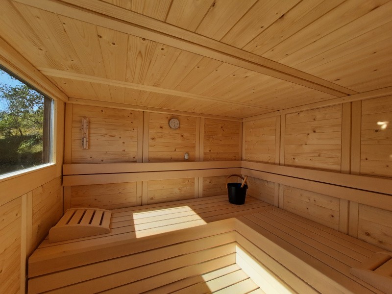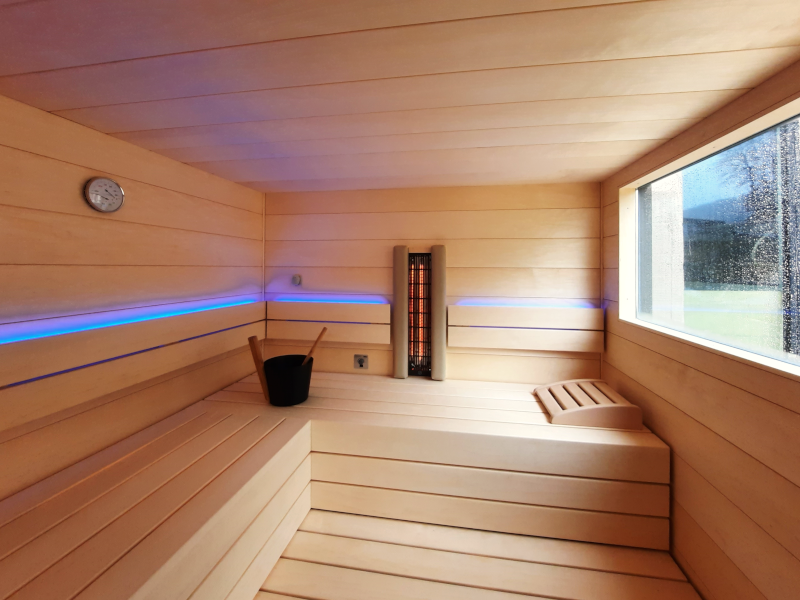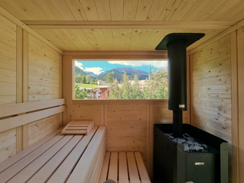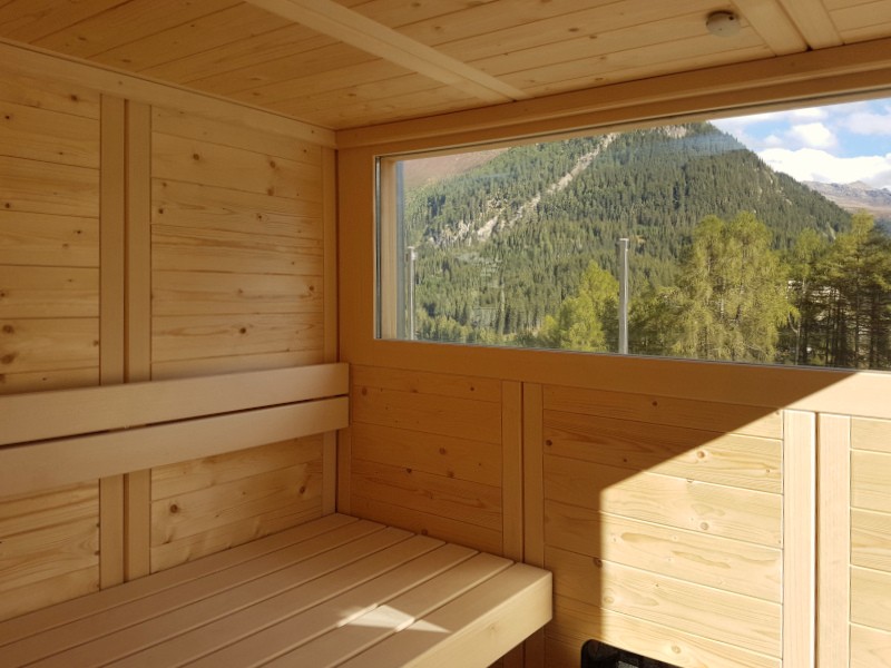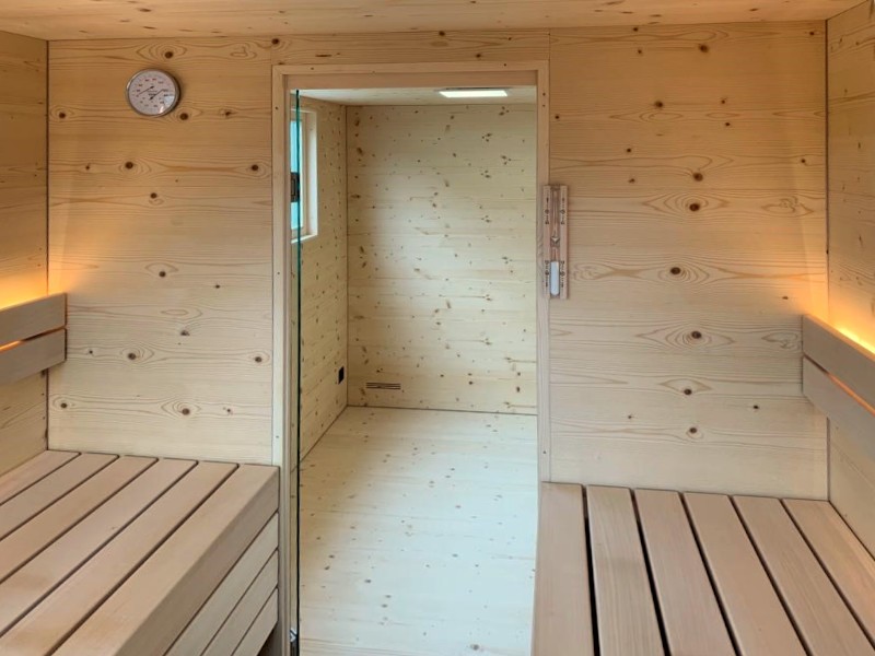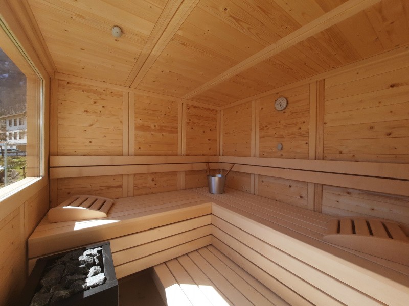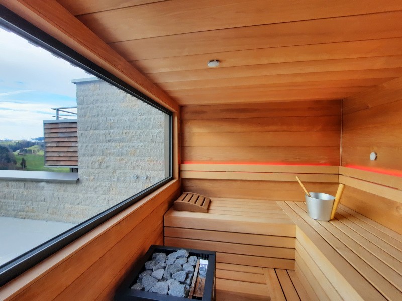 Die wichtigen Merkmale der Massivholz - Sauna liegen in der hohen Wärmespeicherung des Holzes, in einer stabilen gleichmässigen Temperaturschichtung, einem schonenden Abkühlen des Holzkörpers (kein Anfall von Kondenswasser) und - aufgrund der geringeren Oberflächentemperatur - in dem als weich und nicht aggressiv empfundenen Klima.