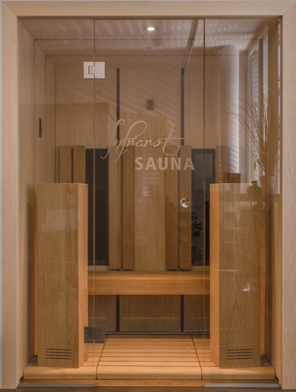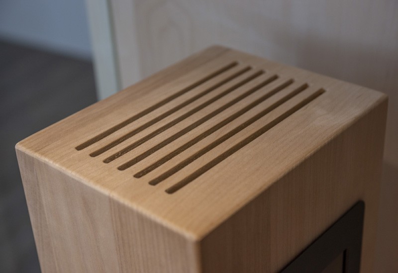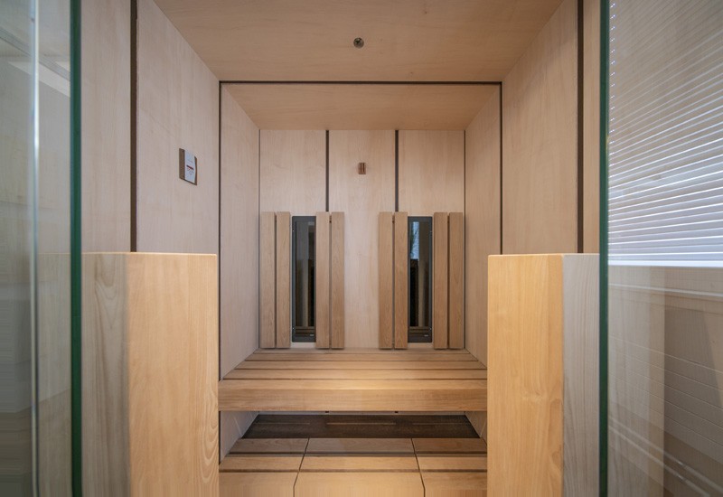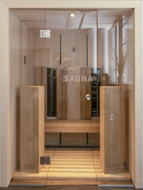 Anders als bei vielen gängigen Infrarotkabinen wirde hier viel Wert auf Design gelegt. Die grossflächigen Paneelen aus Ahorn, welche mit dunklen Federn unterbrochen werden, vermitteln ein edle Optik. Untermalt wird diese durch den Bank, die Rückenlehnen und die beiden Türme, welche in thermobehandelter Espe Ausgeführt sind. In den beiden Türem ist jeweils ein Infrarot- Vollspektrumstrahler eingebaut.
