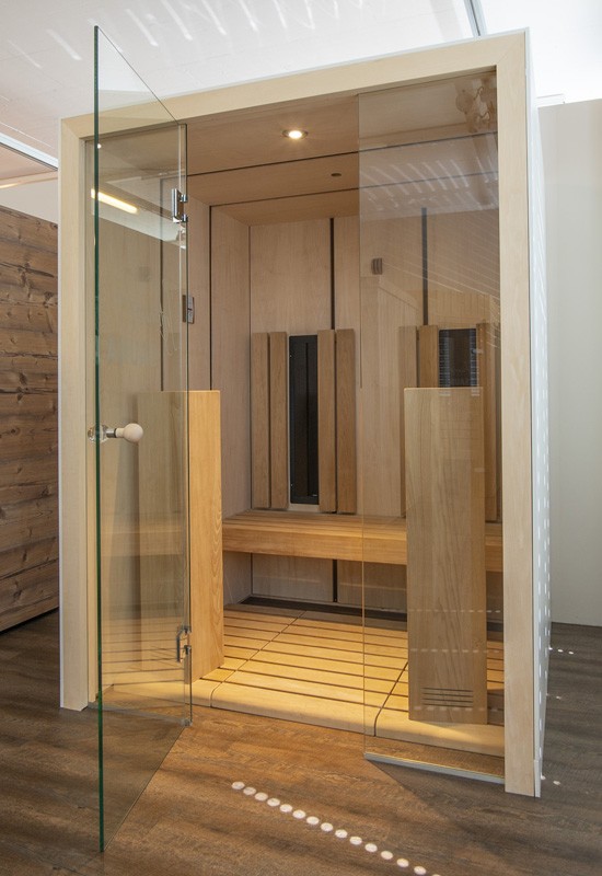 Durch den symetrischen Aufbau der Infrarotkabine einsteht ein ruhiges Bild, welches durch die grosszügige Glasfron abgerundet wird.
