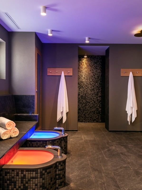 Eines der Highlights ist sicherlich die Sauna, welche aus Arvenholz gefertigt ist. Die Kombination mit den Holzscheiten zwischen und hinter den Bänken und die dunklen Saunabänke verleihen der Sauna einen rustikalen Charme. Das Beleuchtungskonzept der Sauna unterstreicht das Ganze Erscheidungsbild.