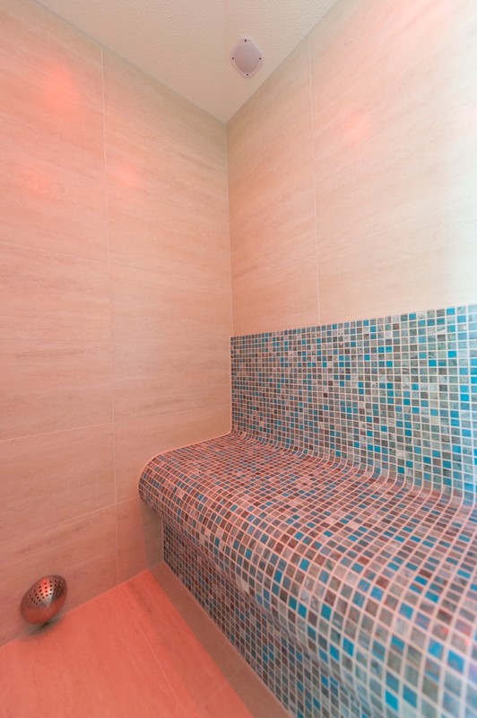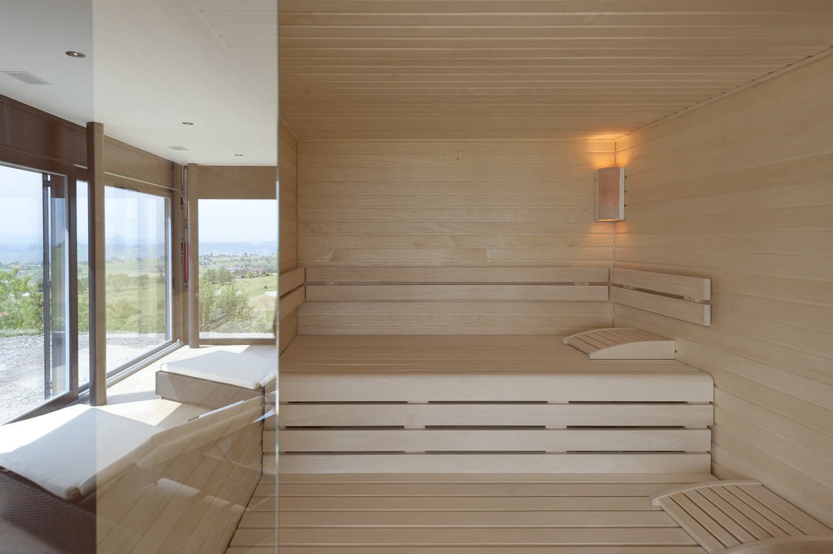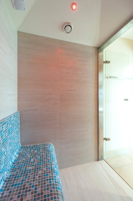 Sauna, Dampfbad, Whirlpool, Fitness- und Ruhebereich, alles was das Herz in Sachen "Wellness" begehrt wurde in diesem privaten Wellnessbereich integriert. Wiederkehrende Materialisierung und Farbgebung sowie dezente Beleuchtung lassen die einzelnen Komponenten zu einem harmonschen Ganzen verschmelzen.