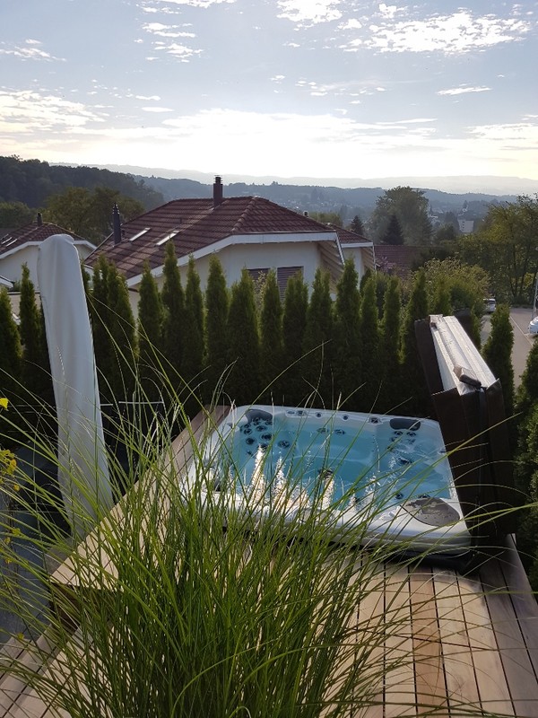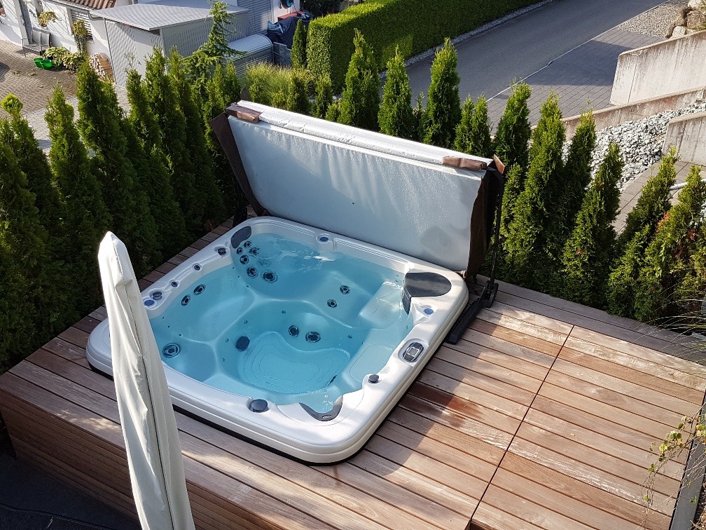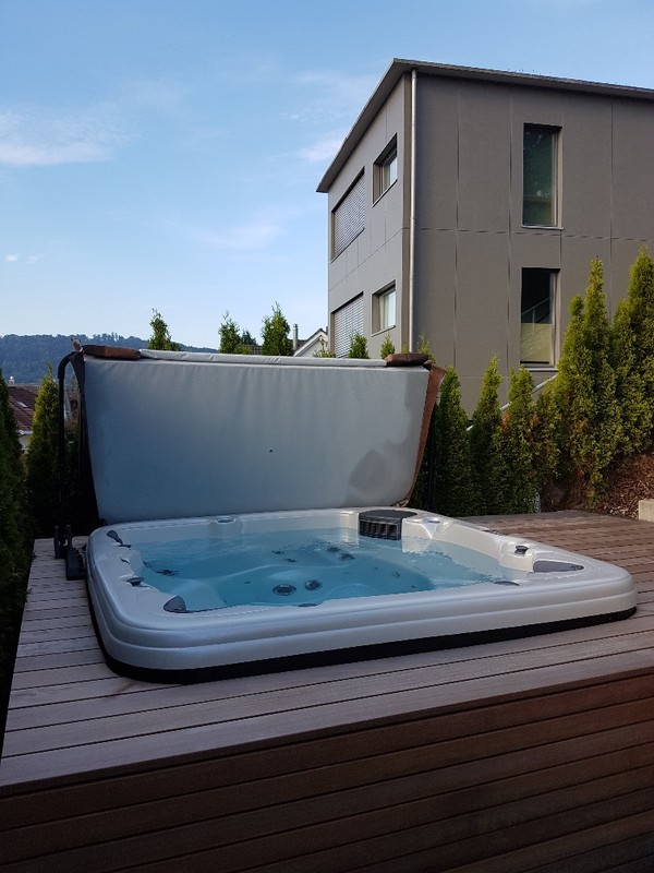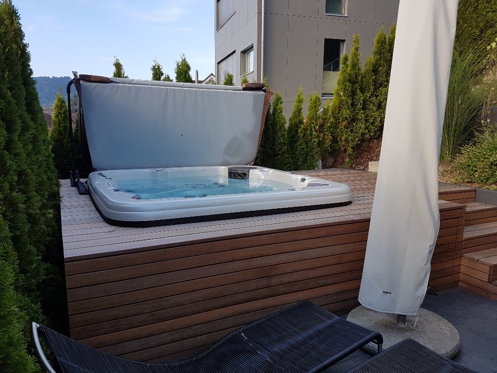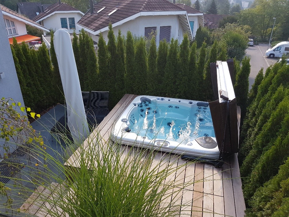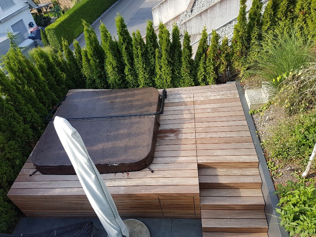 Die Terrasse aus Holz, welche den Whirlpool umgibt, kann als Liegefläche und Abstieg auf die tiefer gelegenen Sitzplatz genutz werden. Durch eine Rvisiontür in der Holzkonstruktion ist die Servicefreundllichkeit der Whirlpooltechnik gewährleistet.
