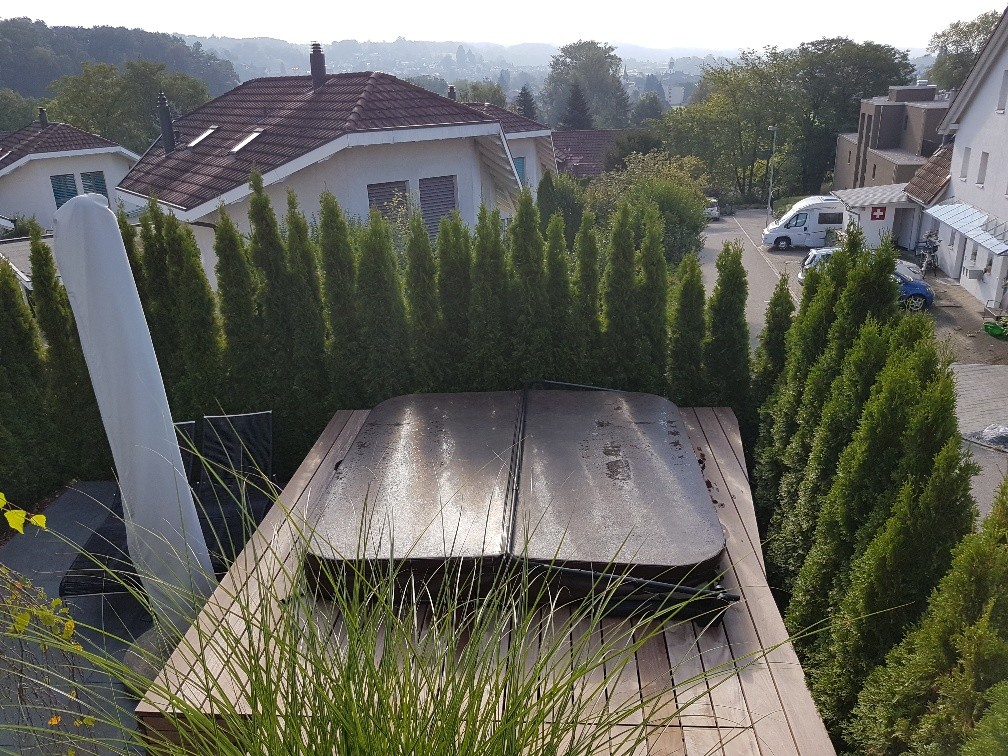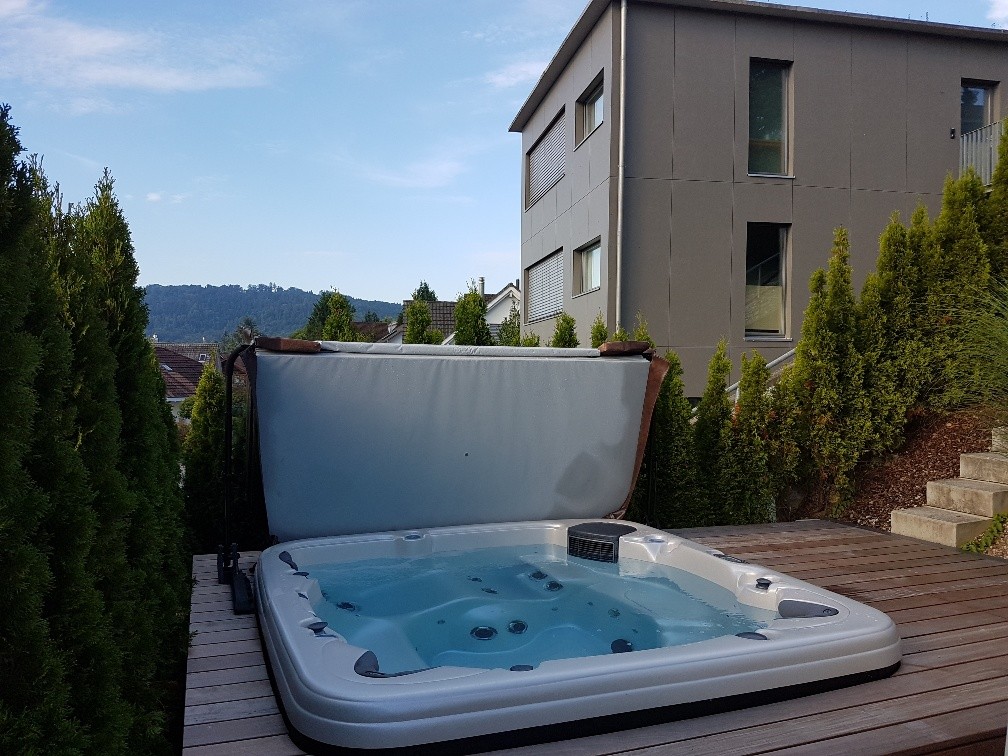 Bei dem in den Hang gebaute Einfamilienhaus wurde eine bin anhin eher selten genutzter Bereich des Gartens mit einem Whirlpool samt Terrasse rundherum massiv aufgewertet.