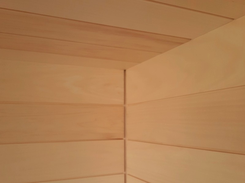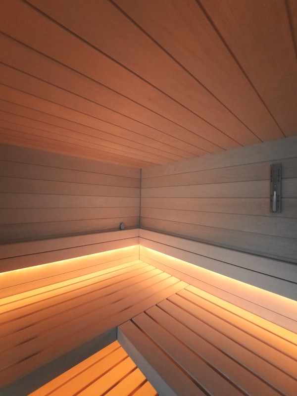 Um das moderne, schlichte Design des Raumes zu übernehmen wurde die Sauna innen mit einem scharfkantigen Breit- Profil in hellem Espen- Holz ausgeführt. Die horizontale Verlegeweise des Saunaholzes trägt ebenfalls zum modernen Look bei.