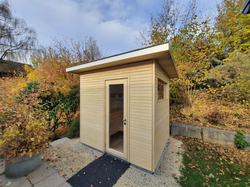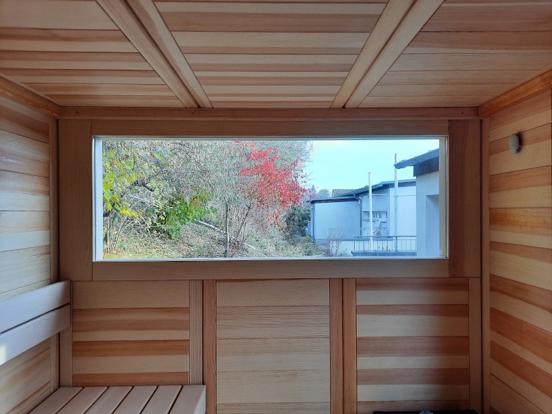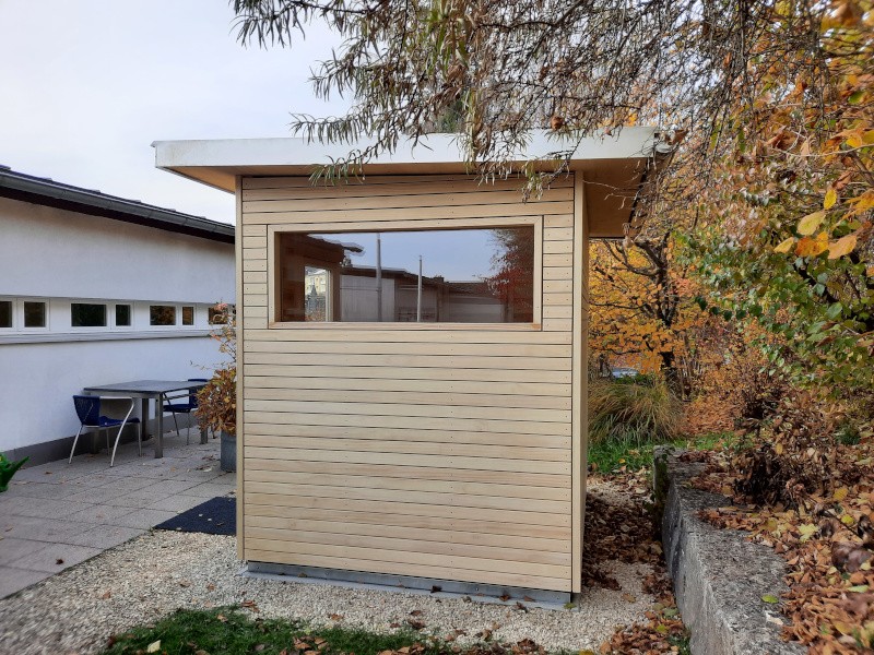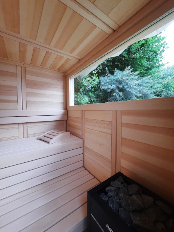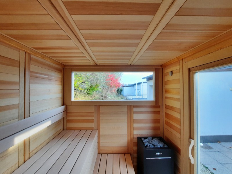 Beim Saunieren bietet das Panoramafenster den Blick in Grüne, was die Sauna im Innern grösser wirken lässt. Kombiniert mit einem finnischen Saunaofen ein geniales Saunaerlebnis.