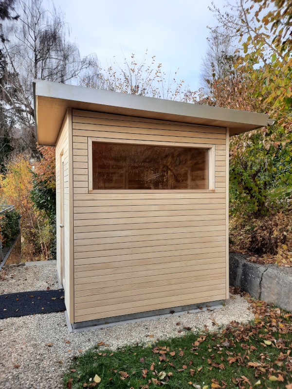 Das Dach der Gartensauna wurde als Pultdach ausgeführt und in Zusammenarbeit mit dem ortsansässigen Spengler gleich eingedeckt wie das angrenzende Wohnhaus.
