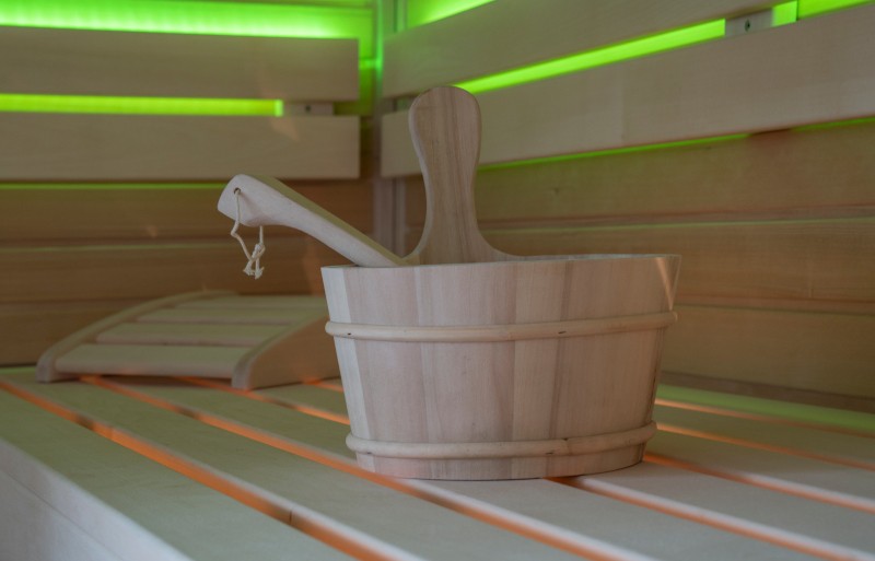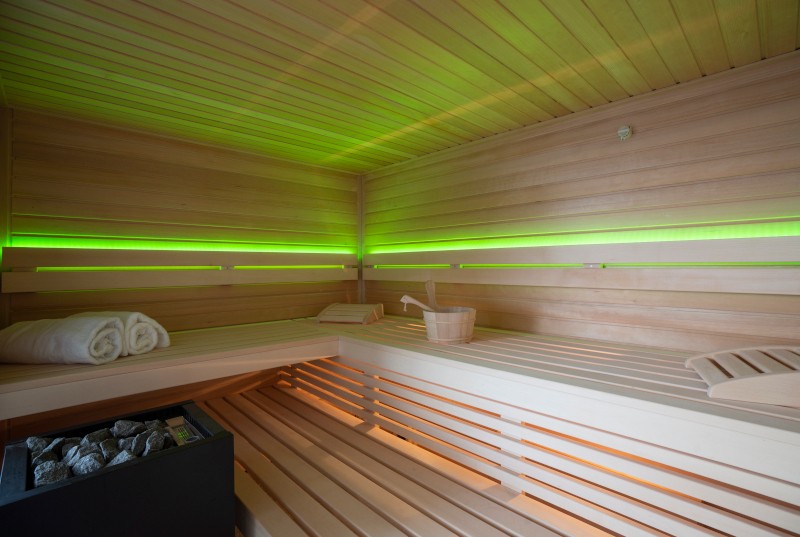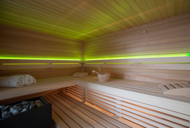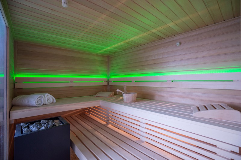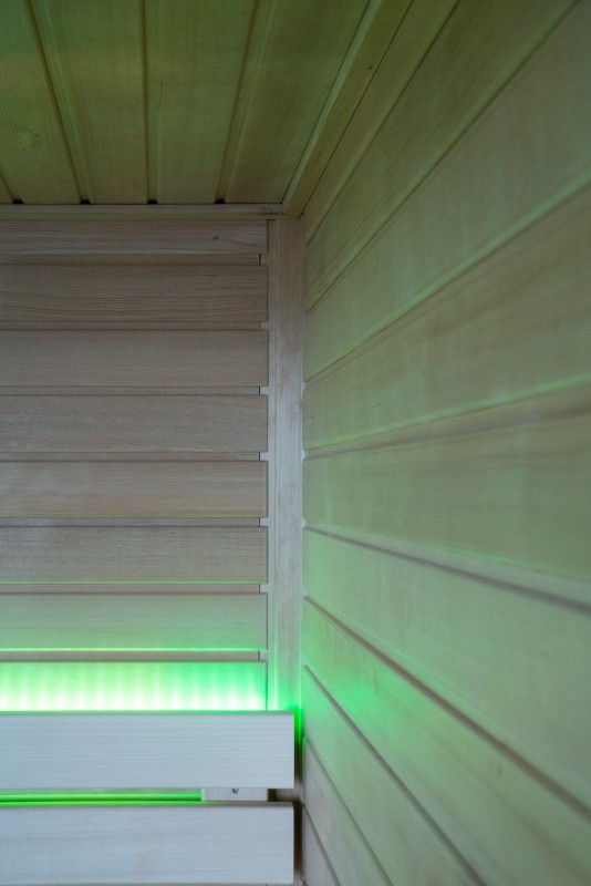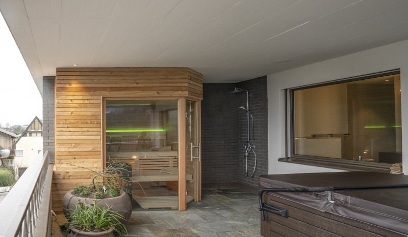 Nebst der angrenzenden Aussendusche, dem Whirlpool und dem direkten Zugang zum Badezimmer, rundet die Sauna den privaten Wellnessbereich ab. Gerade am Abend ist der Blick aus dem Badezimmer auf den Balkon - mit der Aussensauna - eine wahre Augenweide. Die farbige Saunabeleuchtung, in der Rückenlehne integriert, sorgt für ein dezentes, abwechslungsreiches Ambiente.