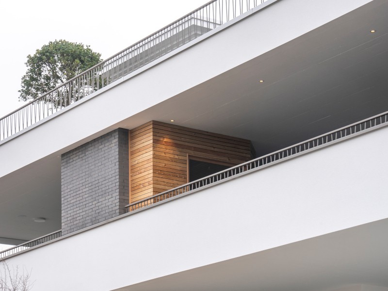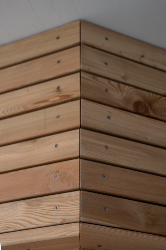 Die Sauna ist im Innern mit einer horizontalen Vertäfelung in Hemlock versehen, aussen wurde die Fassade in einer Rhomboid- Schalung in Lärche ausgeführt. Die beiden Hölzer harmonieren farblich gut zueinander und ergeben einen schönen Kontrast zu den anthrazitfarbenen Wandfliesen und dem Boden in Naturstein. Die sauber ausgeführten Details unterstreichen die Wertigkeit dieser Sauna.