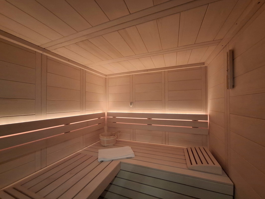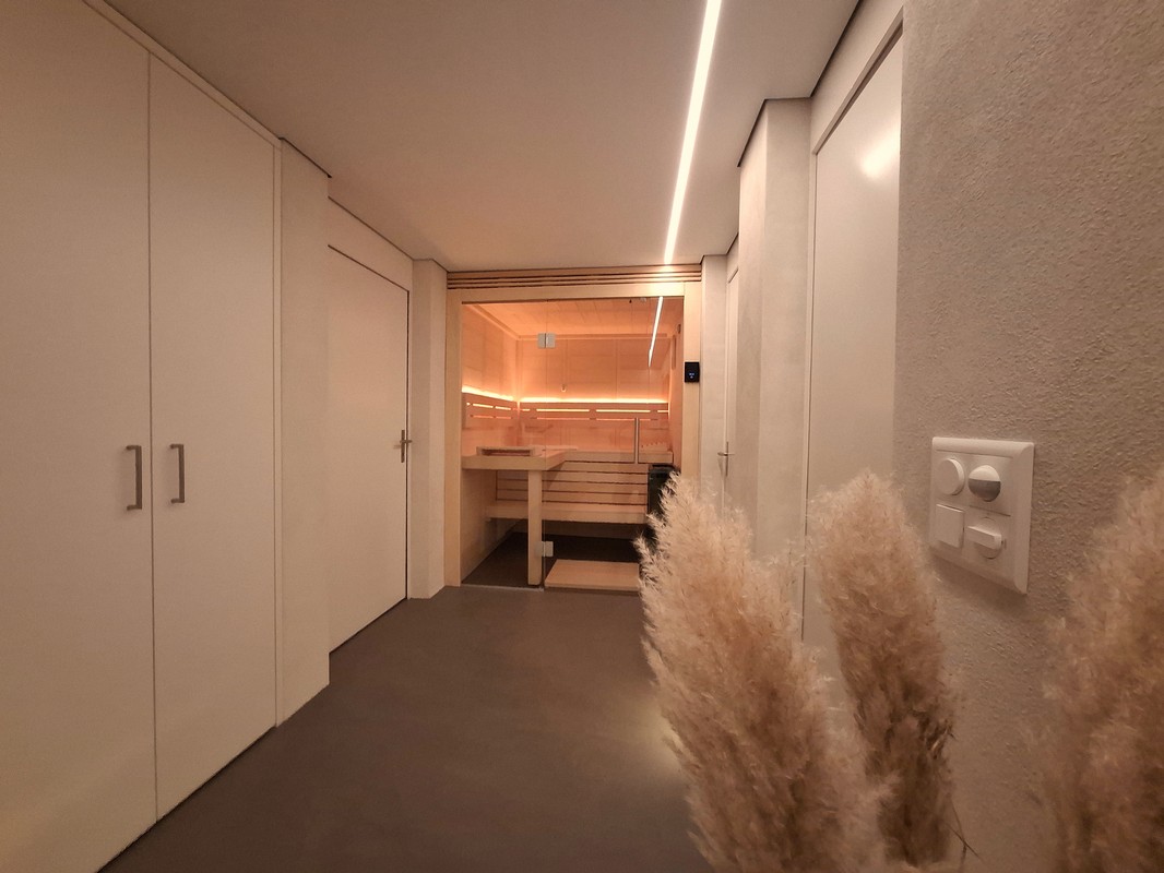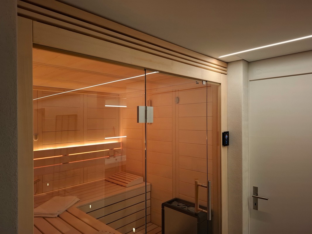 Im Rahmen eines Kellerumbaus durften wir diese schöne Classico Massivholzsauna realisieren. Da die vorhandenen Platzverhältnisse etwas beschränkt waren und die Sauna der Blickfang am Ende des Korridors werden sollte, wurde die Sauna mit einer Ganzglasfront ausgeführt. Für die Beleuchtung hat sich die Bauherrschaft für eine warmweisse Lösung in der Rückenlehne entscheiden. Mit den vorhandenen Beleuchtungselemente vor der Sauna, lassen sich so verschiedene Stimmungen im Raum erzeugen.