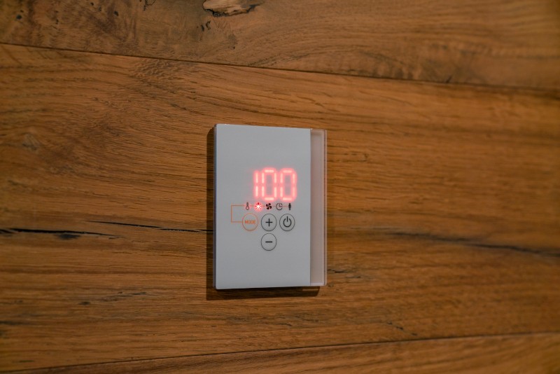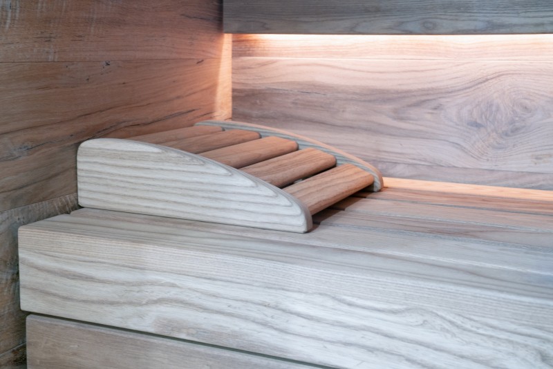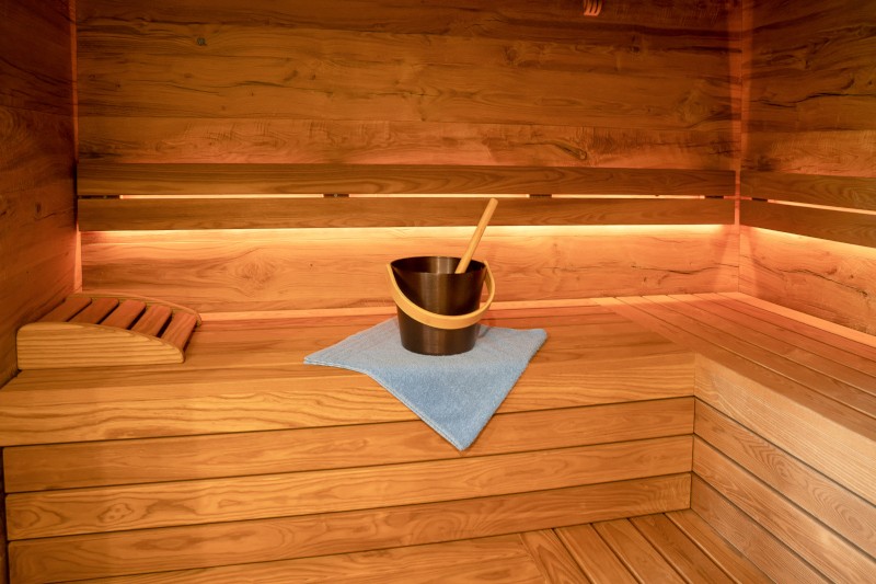 Die Sauna wurde sowohl innen wie aussen in einer Alt Eiche in Paneelenoptik ausgeführt. Die Bänke in Thermo- Esche harmonieren farblich sehr gut zu der Alt Eiche und unterstreichen die edle Optik. Die Glas Ecke ermöglicht den Blick in und aus der Sauna und lässt den Raum grösser wirken. Der schwarze finnische Saunaofen ist das Herzstück der Sauna. Die dezente, warmweisse Saunabeleuchtung, in der Rückenlehne der Sauna integriert, sorgt für ein wohliges Ambiente, das perfekt ist zum Entspannen.