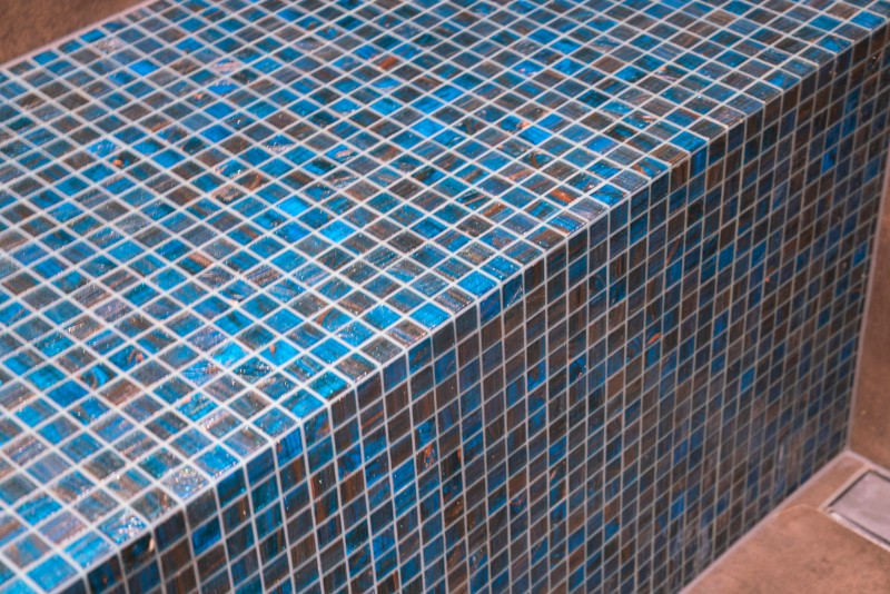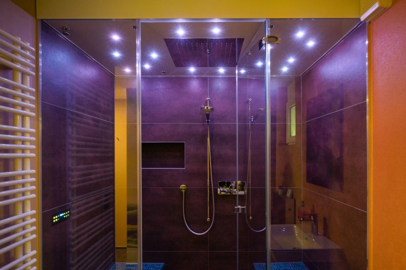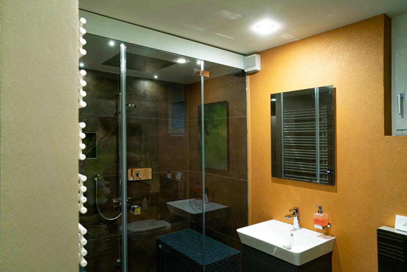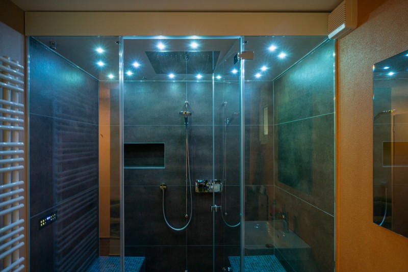 Die Dampfdusche wurde an Stelle der bestehenden Dusche realisiert. Sie wurde mit zwei Sitzen links und rechts und dem Duschbereich in der Mitte ausgeführt. Die Beleuchtung mit einem farbigen Sternenhimmel sorgt für eine abwechslungsreiche Optik. Die beiden Sitzbänke des Dampfbades sind mit blauen Mosaikfliesen versehen, die Wände und der Boden mit einer dunkelbraunen Grossformatfliese.