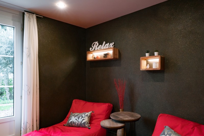 Ein weiteres Highlight dieses privaten Wellnessraumes ist die Gestaltung der Wände. Hier hat sich die Bauherrschaft – welche einen Maler-/ Gipser Betrieb betriebt – voll und ganz ausgelebt. Die beiden Bereiche Badezimmer und Sauna-/ Ruheraum wurden unterschiedlich ausgeführt. Die Wände des Badezimmers wurde mit einem goldenen Putzbelag versehen, der Saunaraum mit Ruhebereich mit einem schwarzen Putzbelag mit Goldpigmenten. Als verbindende Elemente zwischen zwei Bereichen dienen einerseits der Bodenbelag aber auch die beiden Fototapeten mit Ferienmotiven, welche das Arbeiten zumindest für eine gewisse Zeit vergessen lassen…