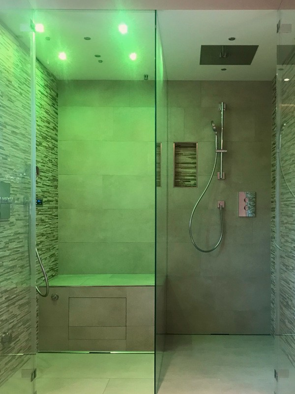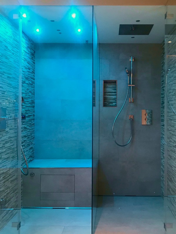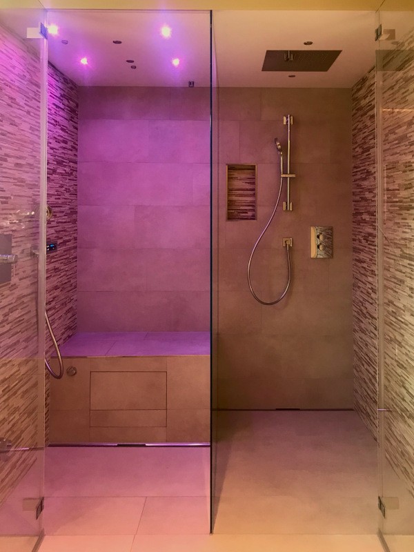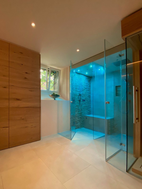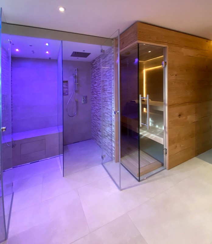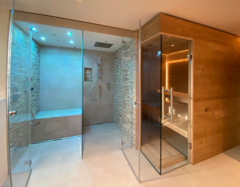 Im nicht isolierten Kellerraum entstand eine edle, grosszügige Sauna, eine Dampfdusche mit einer separaten Dusche sowie genügend Platz für Liegemöglichkeiten zum Ausruhen.