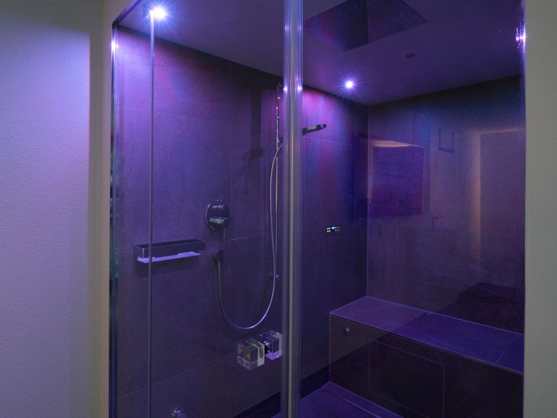 In einem ersten Schritt wurde zusammen mit der Bauherrschaft ein Raumkonzept mit der entsprechenden Wellnesselementen entwickelt. Aufgrund der Wasserinstallationen, welche sich im Nebenraum befanden, war die Position der Dampfdusche gegeben. Gleich daneben wurde die Sauna geplant, mit der Herausforderung, das bestehende Fenster in die Sauna zu integrieren. Die Sauna und die Dampfdusche wurden so geplant, dass sie durch die verbindende Front optisch als Einheit wirken. Das optische Highlight des Raumes ist die beleuchtete Salzsteinwand, welche dem Raum zusammen mit den passenden Farb- und Beleuchtungskonzept einen entspannenden Wellnesscharakter verleihen. Die Wellnessliegen, ein TV und die beleuchtete Teeküche runden den das Konzept des Wellnessraumes ab.
