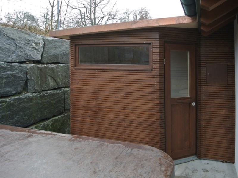 Soll die Verkleidung Ihrer Aussensauna beispielsweise passend zu einem angrenzenden Gebäude mit derselben Holzverkleidung ausgeführt werden, oder haben Sie besondere Vorstellungen von Ihrer Holzfassade, auch das ist bei uns möglich. Die Holzschalung wird dem bestehenden Gebäude angepasst oder nach Ihren Vorstellungen gefertigt und als hinterlüftete Fassade auf die Saunakonstruktion angebracht. Auch farblich haben Sie die Qual der Wahl, egal ob Lasur, naturbelassen oder Vorvergrauung, erlaubt ist, was gefällt.