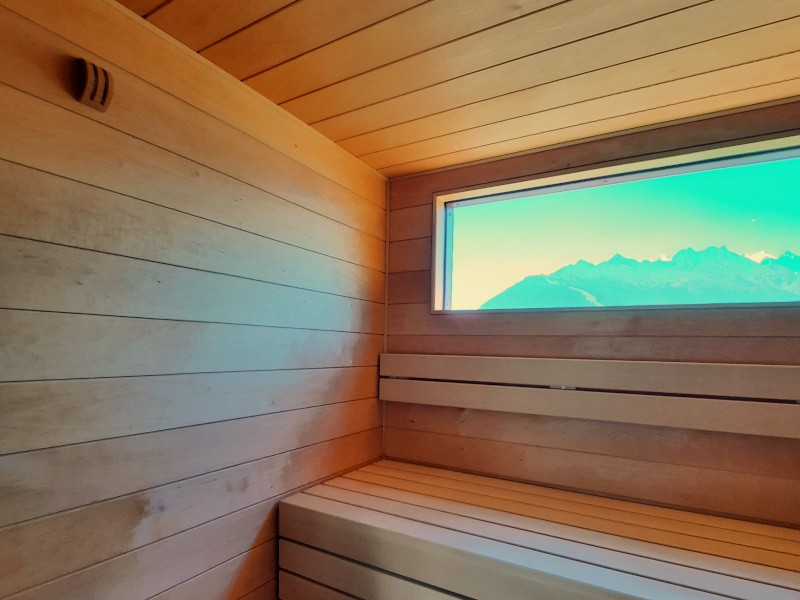 Bei der Sauna in Elementbauweise besteht die Grundkonstruktion aus einem mehrschichtigen Aufbau. Auf der Innenseite – also in der Sauna – werden die Wände und Decke mit einem Massivholztäfer oder speziellen Sauna-Paneele versehen. Es stehen eine Vielzahl verschiedener Hölzer, Profilformen zur Auswahl und auch die Verlege- Richtung (vertikal oder horizontal) kann gewünscht werden. Dadurch hat man bei der Gestaltung im Vergleich zur Massivholzbauweise im Innern der Sauna mehr Auswahlmöglichkeiten.
