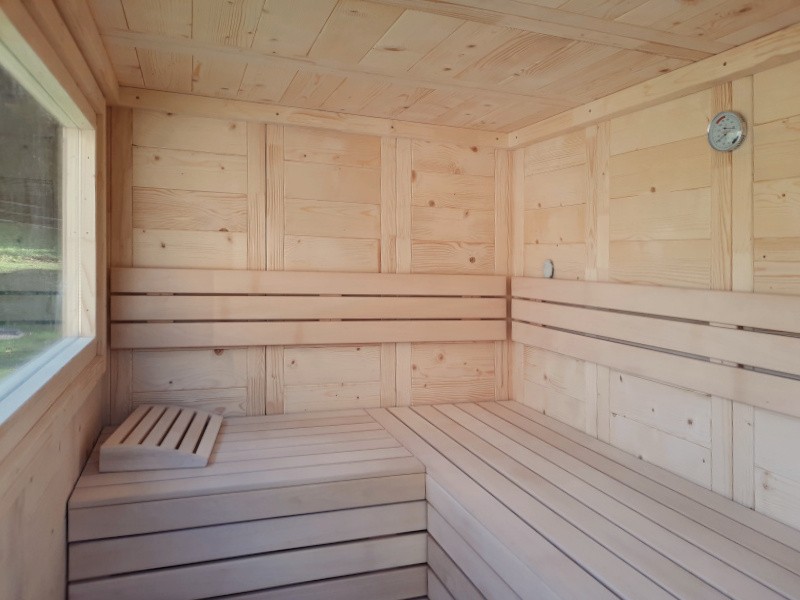 Die wichtigen Merkmale der Massivholz - Sauna liegen in der hohen Wärmespeicherung des Holzes, in einer stabilen gleichmässigen Temperaturschichtung, einem schonenden Abkühlen des Holzkörpers (kein Anfall von Kondenswasser) und - aufgrund der geringeren Oberflächentemperatur - in dem als weich und nicht aggressiv empfundenen Klima.